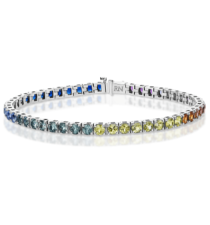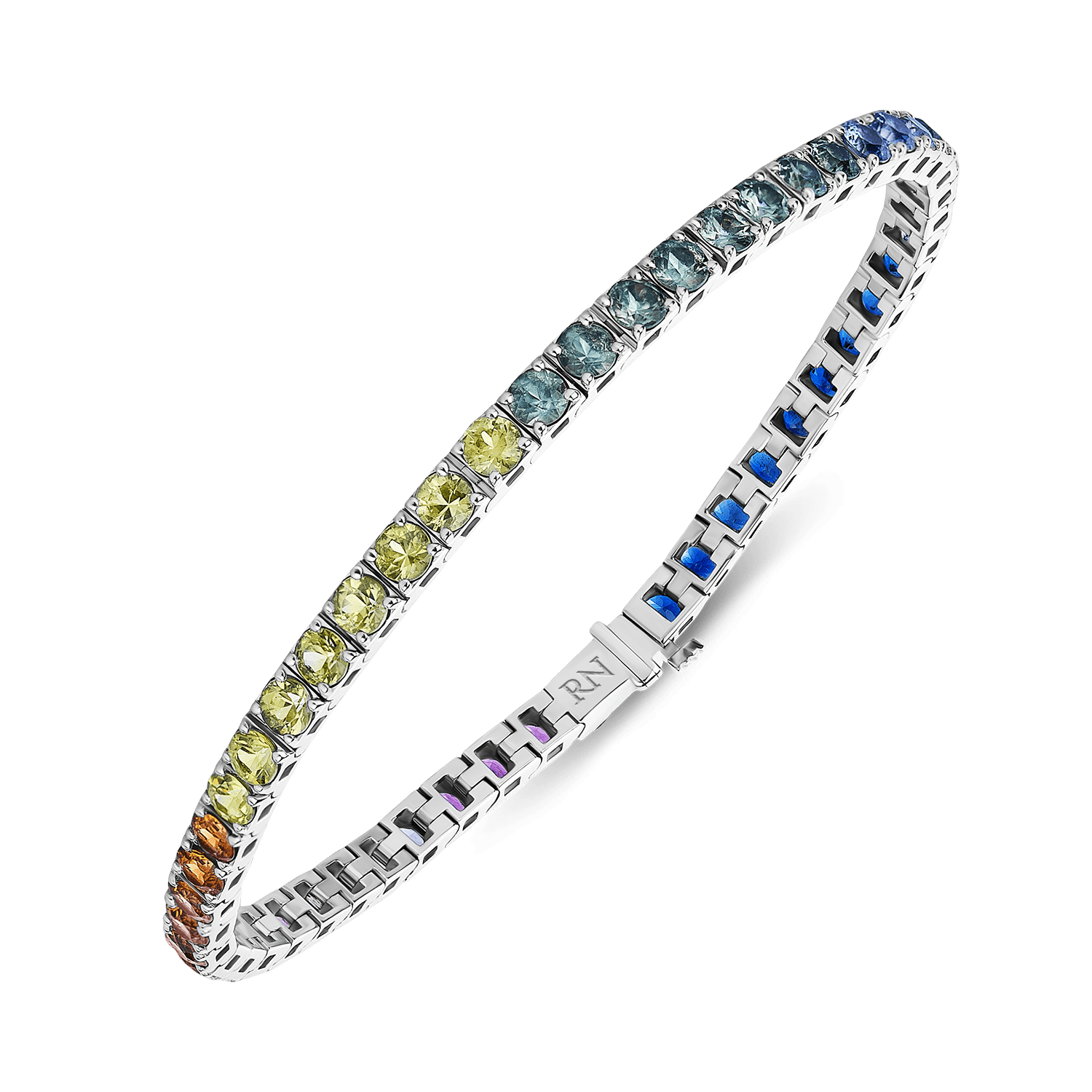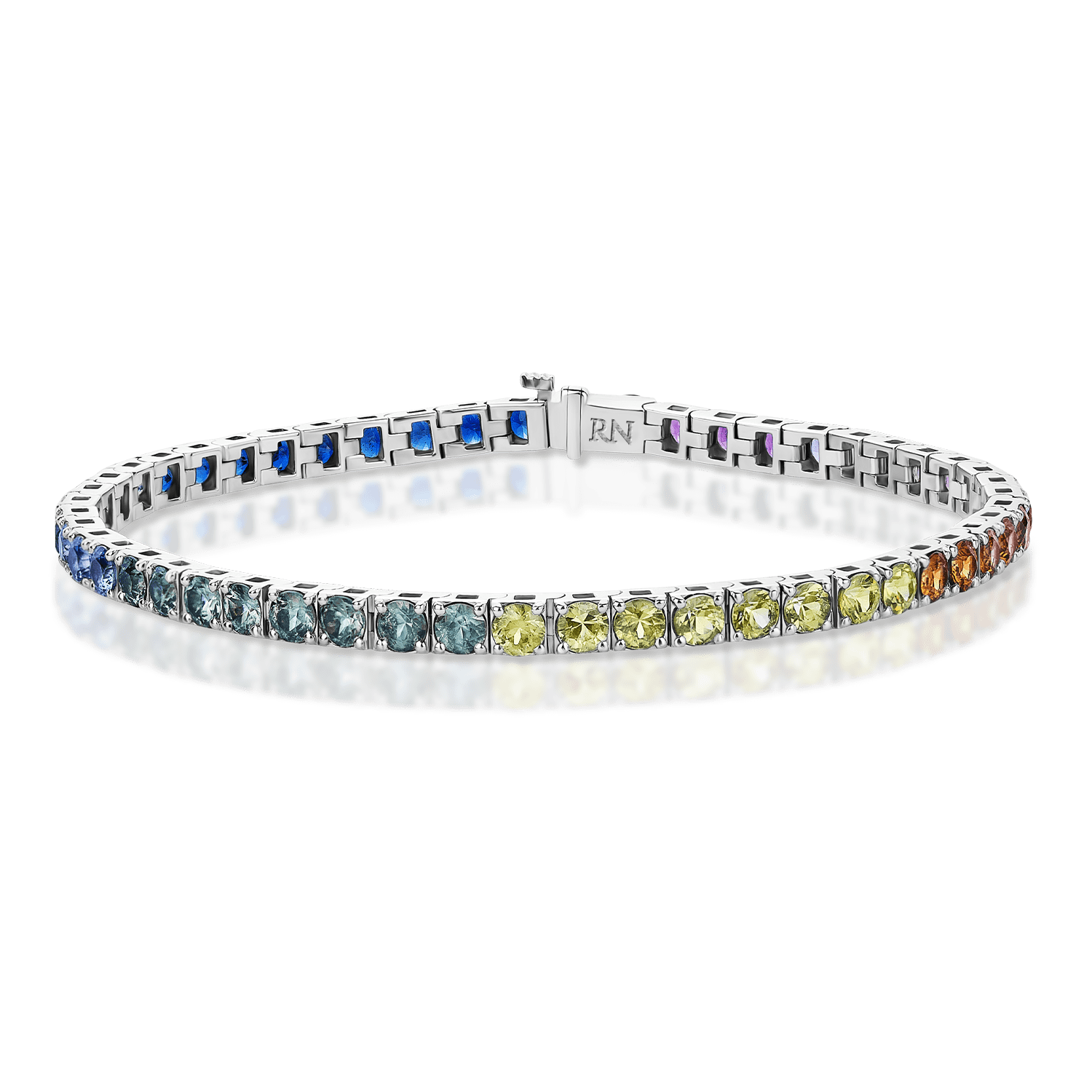 Мягкий теннисный браслет из белого золота инкрустирован дорожкой разноцветных сапфиров. Стильный, искрящийся, утонченный браслет-дорожка – культовое украшение, пришедшее с корта, и ставшее универсальным украшением на любой случай. В изделии надежный коробчатый замок, способный выдержать большой вес вставок.