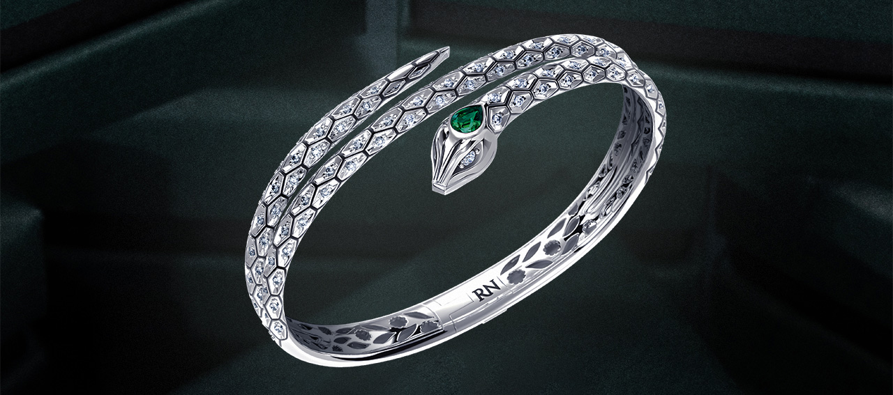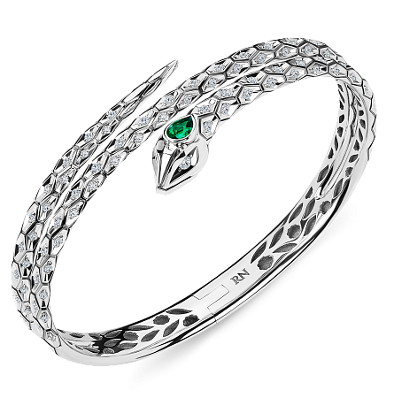 Гибкое тело с геометрическим рисунком, имитирующим чешую, инкрустировано бриллиантами и увенчано таинственным изумрудом.