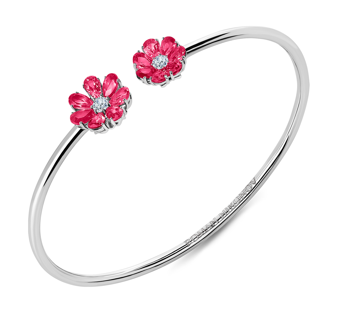 Нежный гибкий браслет из 18-ти каратного белого золота с двумя волшебными цветками в центре. Яркие лепестки цветика из рубиновых камней огранки «груша». Сердцевина цветка украшена бриллиантом классической огранки. Преимущество браслета в его утонченной, гибкой форме, благодаря которой украшение легко надевать. Браслет изящно смотрится на запястье, а игра света подчеркивает яркий колорит драгоценных лепестков.