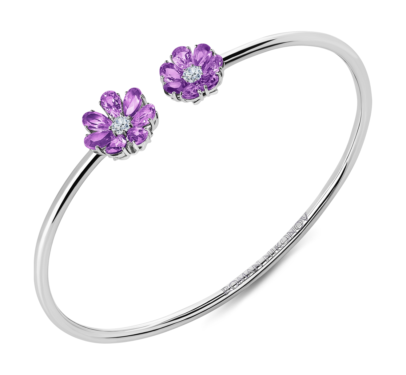 Нежный гибкий браслет из 18-ти каратного белого золота с двумя волшебными цветками в центре. Яркие лепестки цветика из аметистов огранки «груша». Сердцевина цветка украшена бриллиантом классической огранки. Преимущество браслета в его утонченной, гибкой форме, благодаря которой украшение легко надевать. Браслет изящно смотрится на запястье, а игра света подчеркивает яркий колорит драгоценных лепестков.