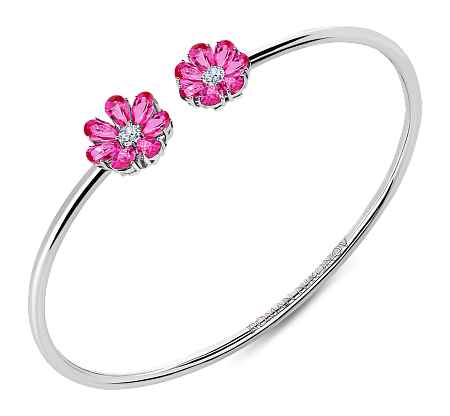 Нежный гибкий браслет из 18-ти каратного белого золота с двумя волшебными цветками в центре. Яркие лепестки цветика из топазов огранки «груша». Сердцевина цветка украшена бриллиантом классической огранки. Преимущество браслета в его утонченной, гибкой форме, благодаря которой украшение легко надевать. Браслет изящно смотрится на запястье, а игра света подчеркивает яркий колорит драгоценных лепестков.