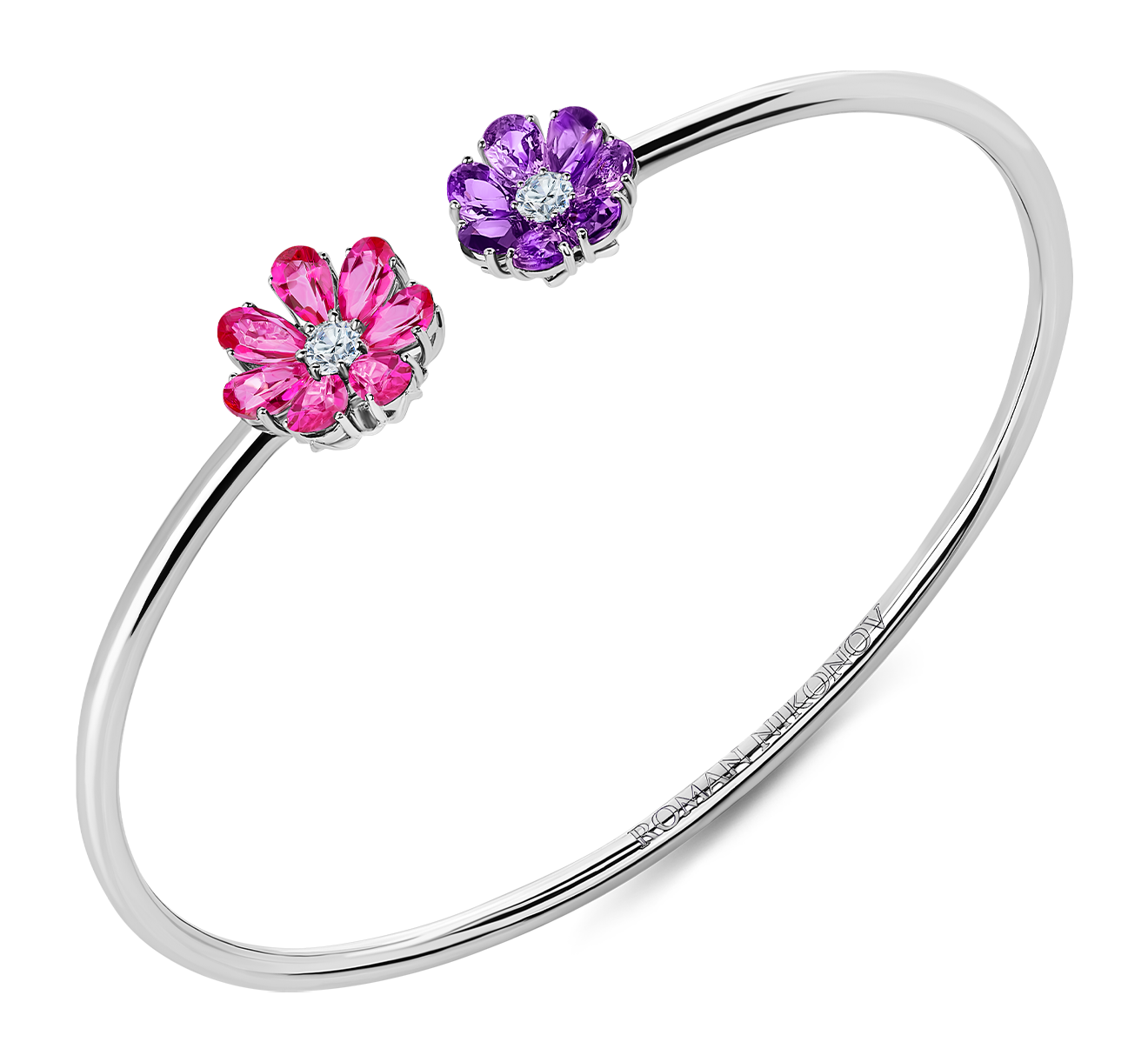 Нежный гибкий браслет из 18-ти каратного белого золота с двумя волшебными цветками в центре. Яркие лепестки цветика из аметистов и топазов огранки «груша». Сердцевина цветка украшена бриллиантом классической огранки. Преимущество браслета в его утонченной, гибкой форме, благодаря которой украшение легко надевать. Браслет изящно смотрится на запястье, а игра света подчеркивает яркий колорит драгоценных лепестков.