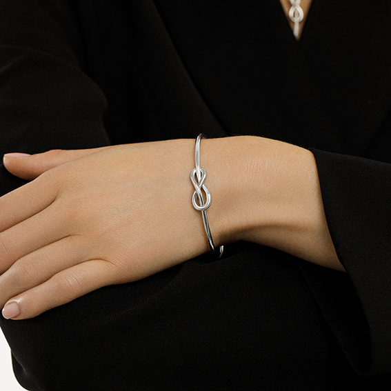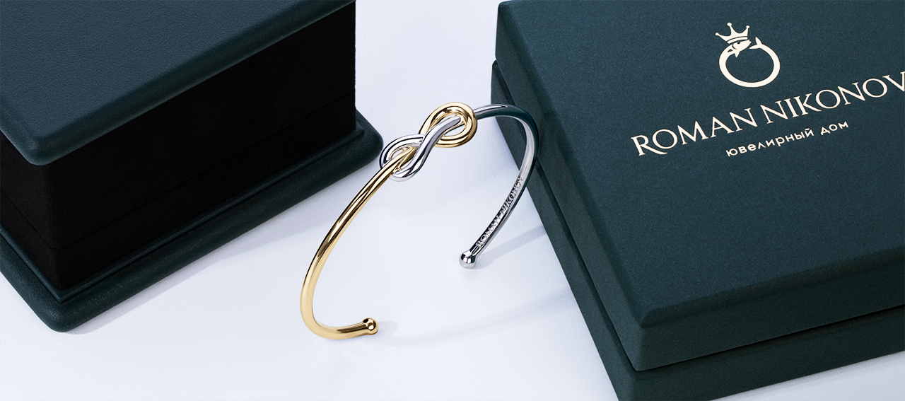 Браслет в виде незамкнутого кольца с золотой нитью, образующей узел – символ бесконечности.