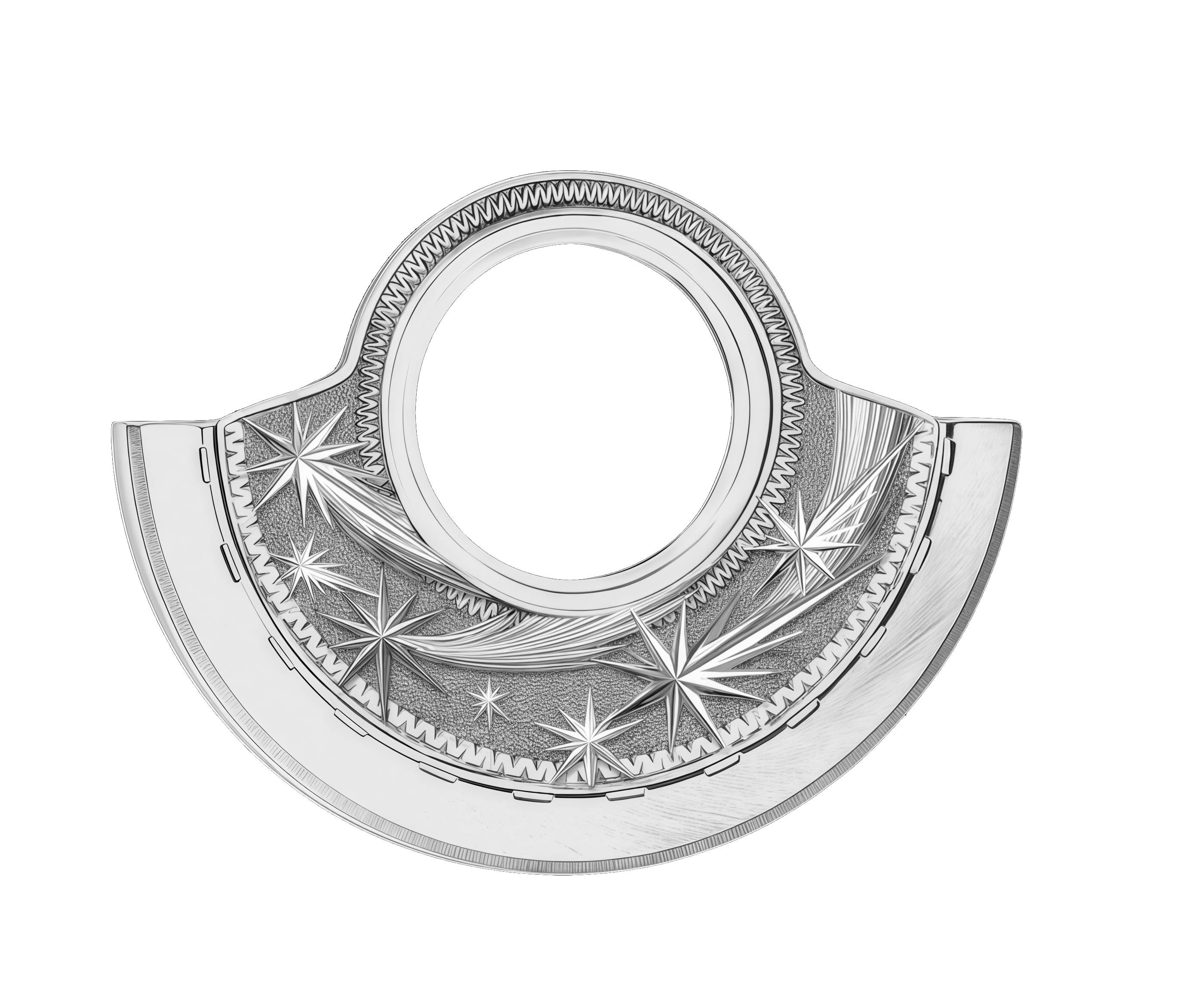 Дополняют фактуру силуэты космических тел, выгравированные вручную. Гравировка – декоративное искусство. Мастер-гравер, используя тщательно подобранный набор инструментов, вручную под микроскопом вырезает изысканные рисунки на самых благородных материалах. С высокой точностью он создает рельеф на поверхности, действуя с невероятной осторожностью и терпением, ведь малейшее неверное движение может перечеркнуть результат многодневной работы и потребовать начать все заново.