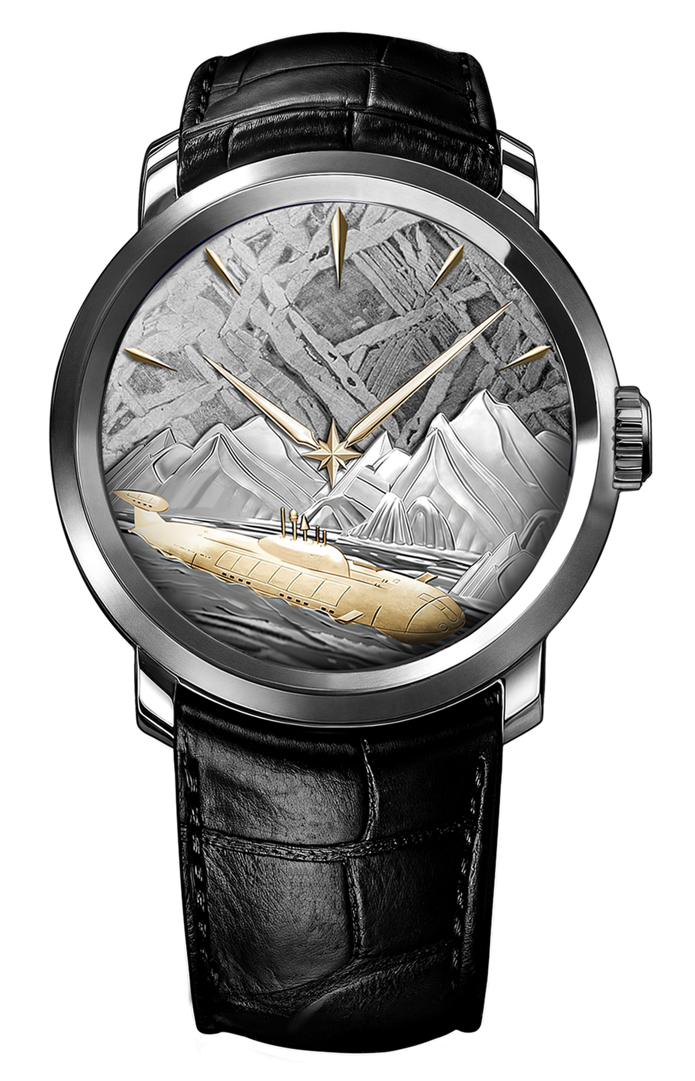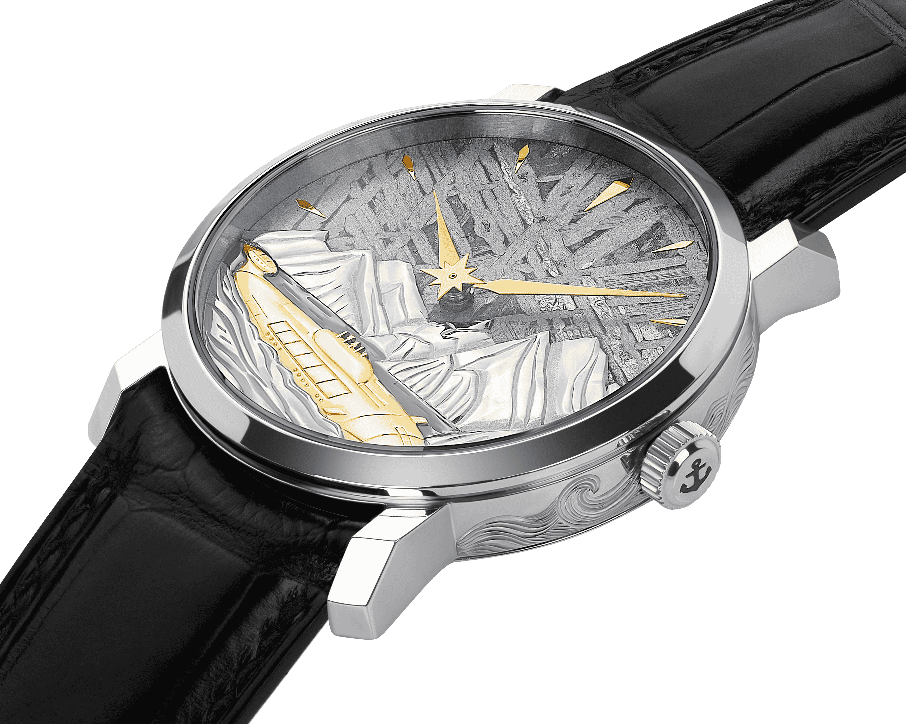 Их уникальный циферблат, выполненный из натурального метеорита, завораживает своим узором и игрой света, напоминая о бескрайних морских просторах.