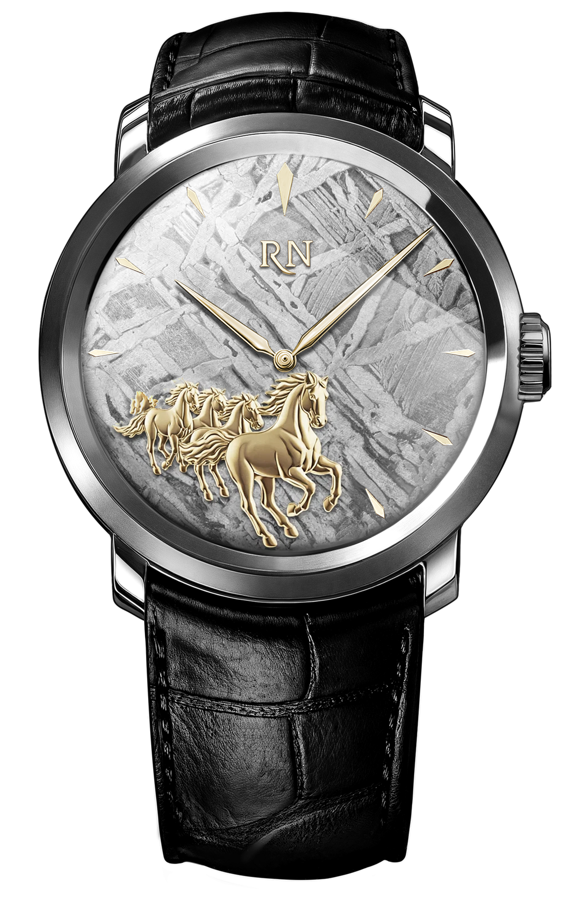 Уникальный циферблат, выполненный из натурального метеорита, словно хранит следы пути: его узор Муонионалуста напоминает землю, по которой мчится табун, оставляя за собой историю и время.