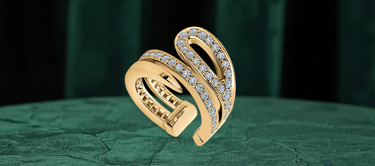 Двойной кафф «Кащеева игла» из желтого золота инкрустирован бриллиантовым павэ. Стильное украшение, станет изюминкой и подчеркнет вашу индивидуальность.