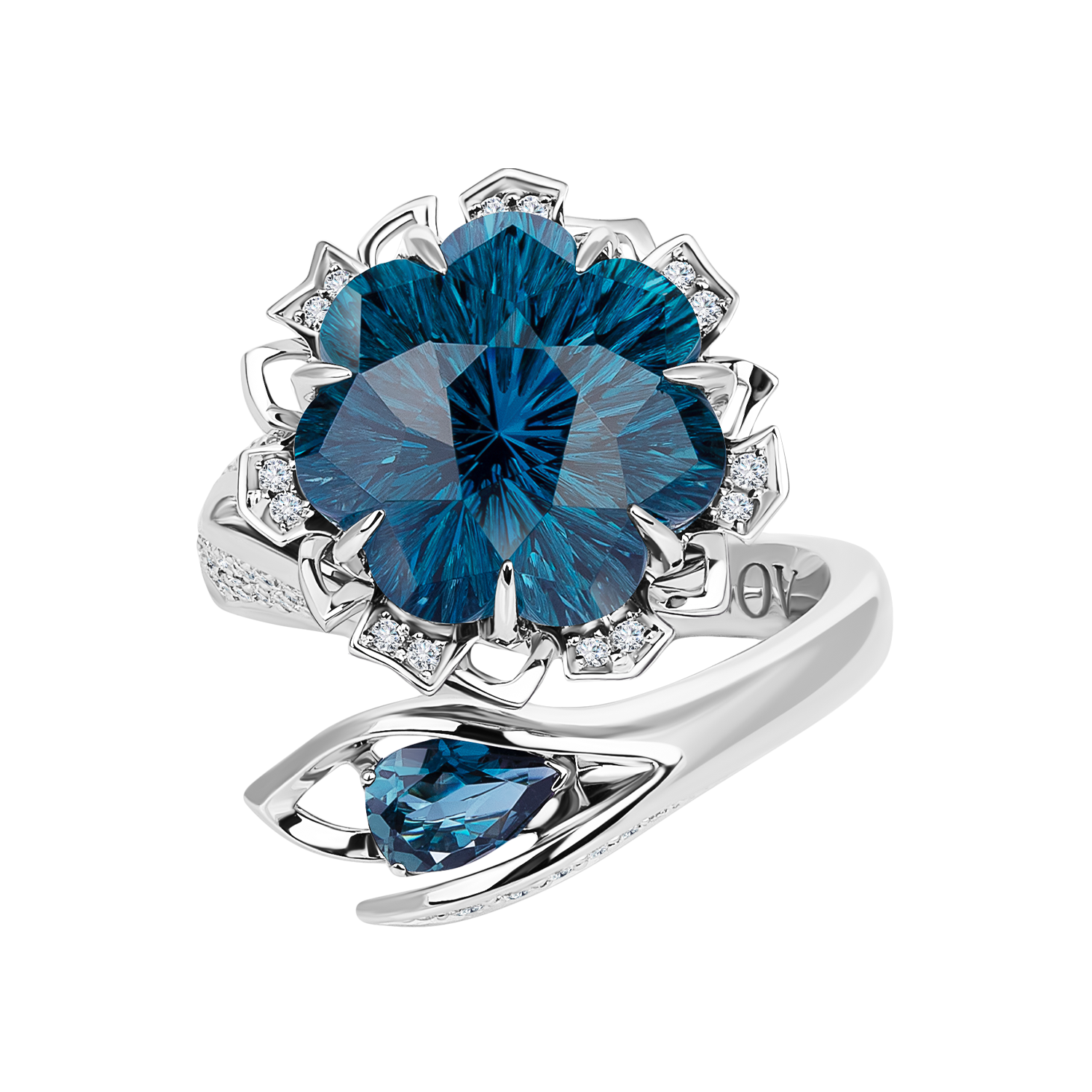 Фантастическое разомкнутое кольцо из белого золота 750 пробы с бриллиантами и топазами London.