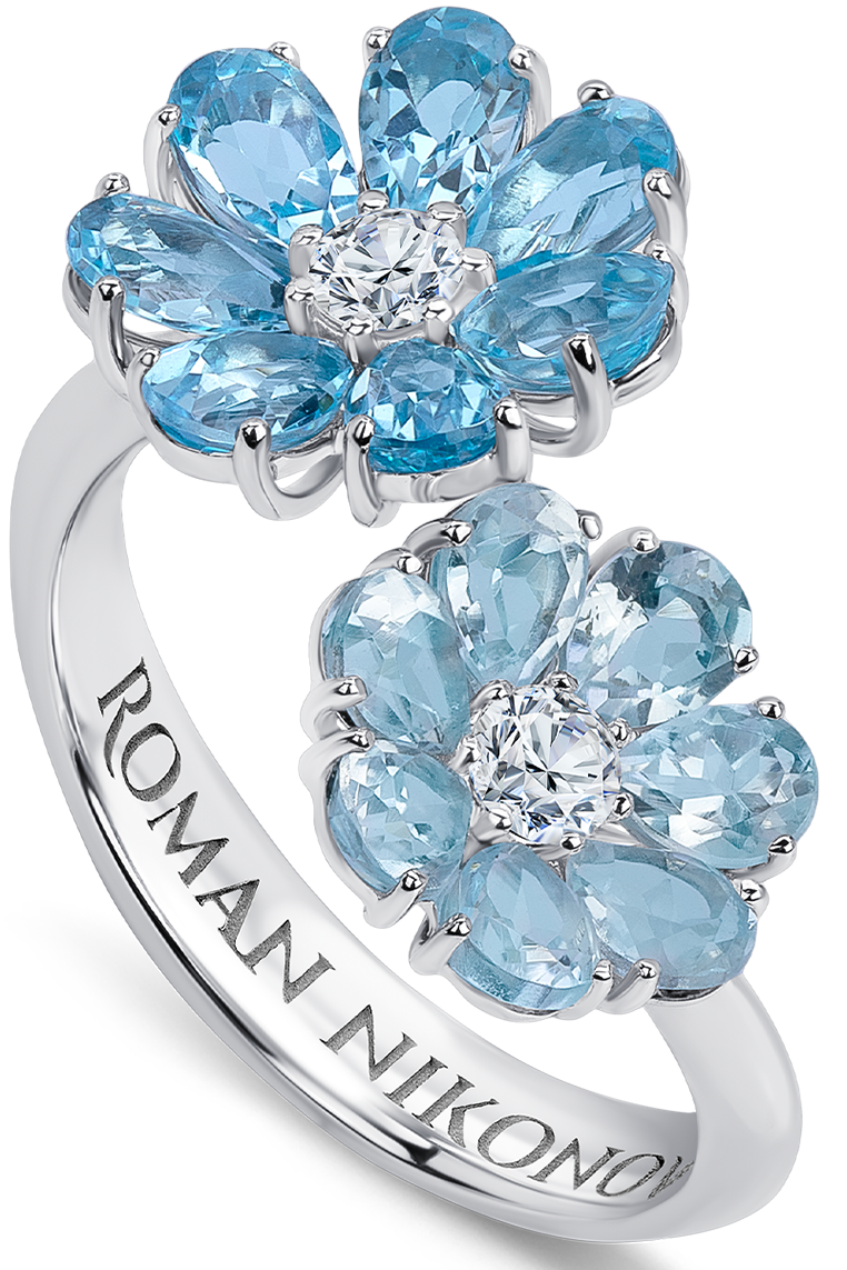 Разомкнутое кольцо из белого золота, украшенное двумя цветками невероятно нежных, и в тоже время глубоких оттенков. Центральный элемент кольца – два цветка с 7 лепестками – топазами Свисс и Скай огранки «груша» – и сердцевиной – бриллиантом классической огранки. Кольцо с динамичным дизайном. Небесно и ярко-голубые лепестки топаза завораживают глубиной и холодным блеском. Украшение достойно Снежной королевы! Кто покорит и растопит ее сердце? Она решит сама.