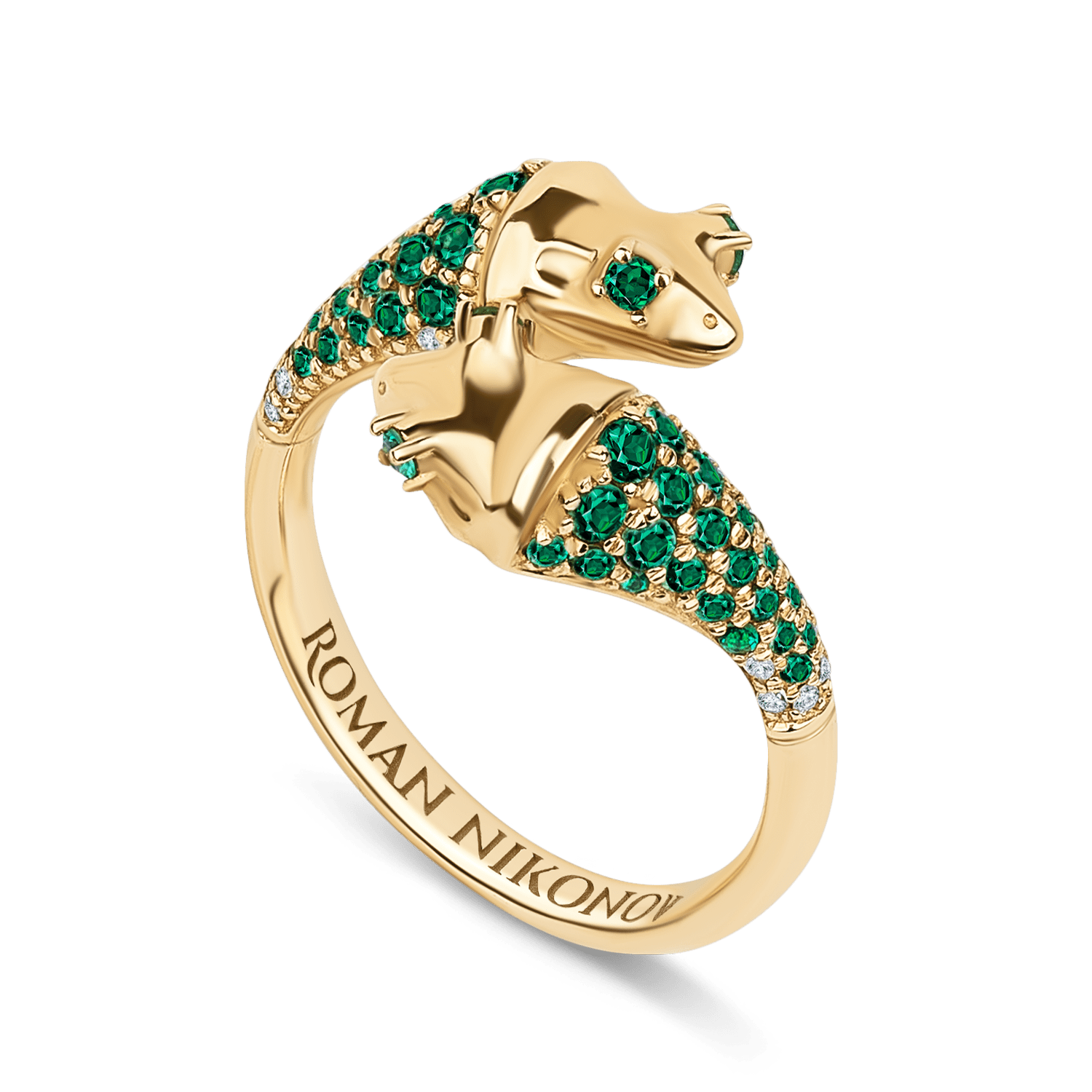 Кольцо "Лягушки-подружки " из желтого золота 750 пробы с изумрудами. Коллекция “Сказки”.
