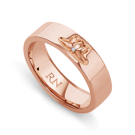 Необыкновенное кольцо из розового золота с широкой шинкой. В центре - изящная лилия с бриллиантом в основании. Этот цветок имеет многогранный символизм от чистоты и непорочности до власти и изобилия. Недаром лилия украшала фамильные королевские гербы Старого и Нового света.