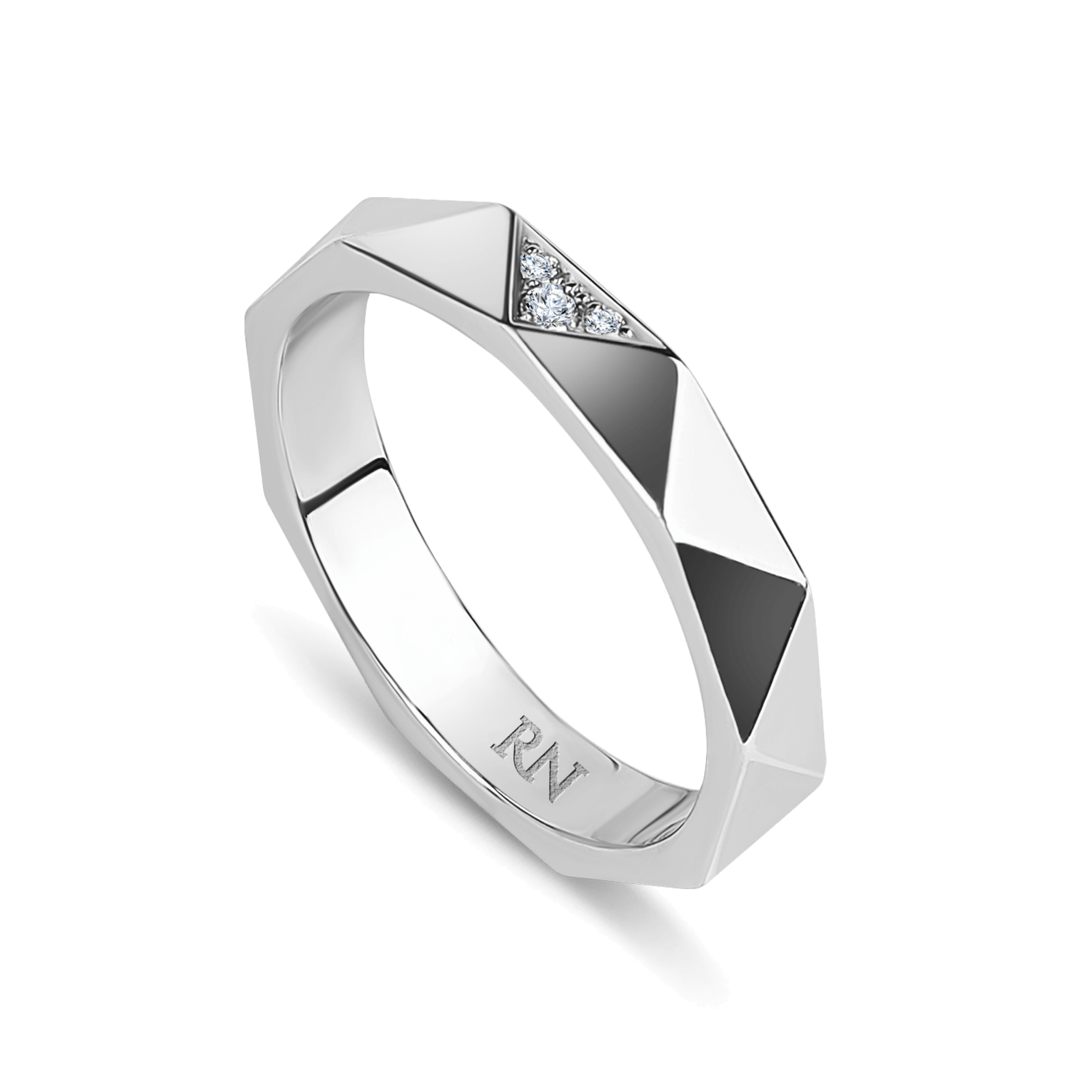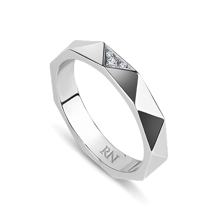 Обручальное полновесное кольцо из белого золота с текстурой призмы и пирамидой с 3 бриллиантами на центральной грани. Средняя ширина шинки.