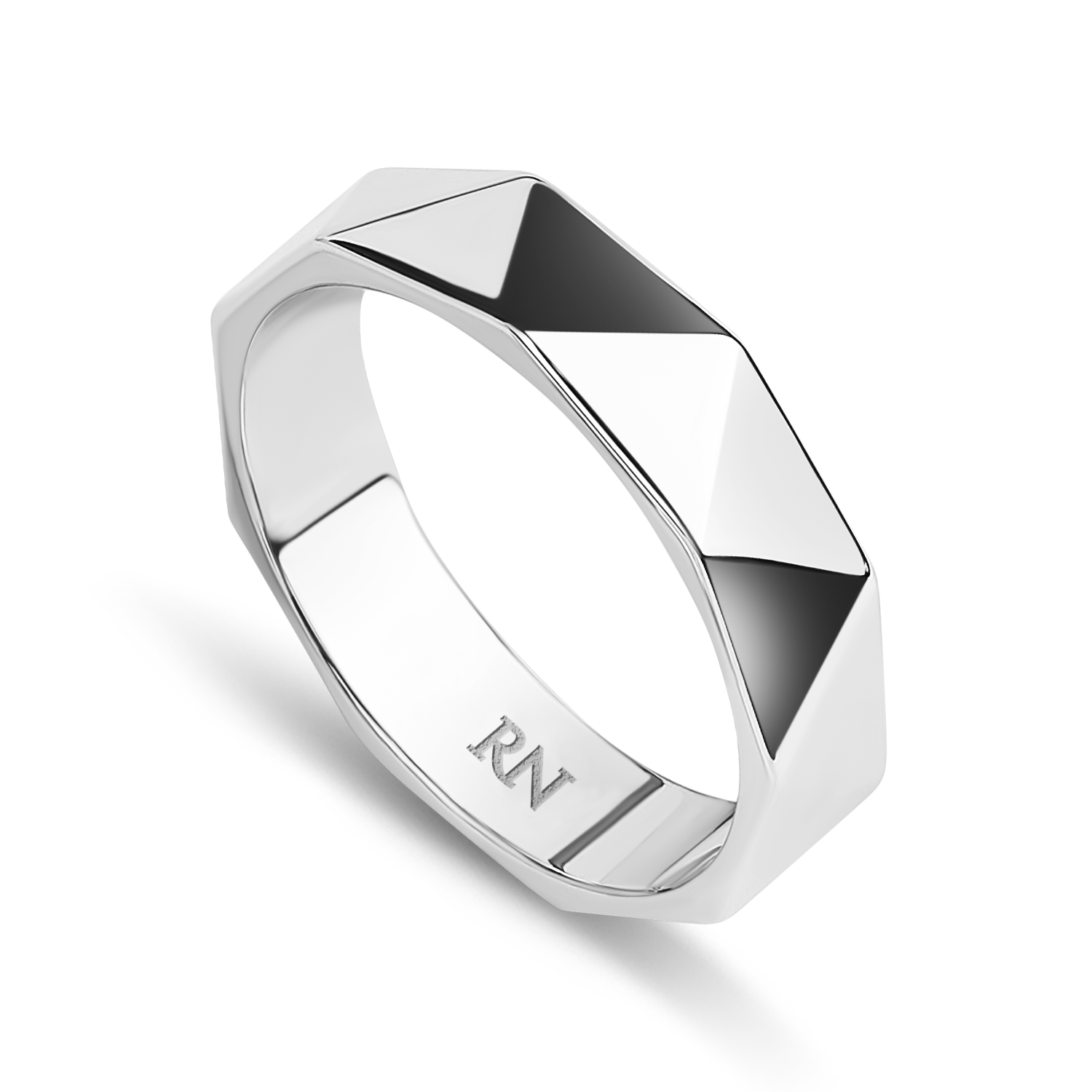 Обручальное полновесное кольцо из белого золота с текстурой призмы без вставок. Средняя ширина шинки.