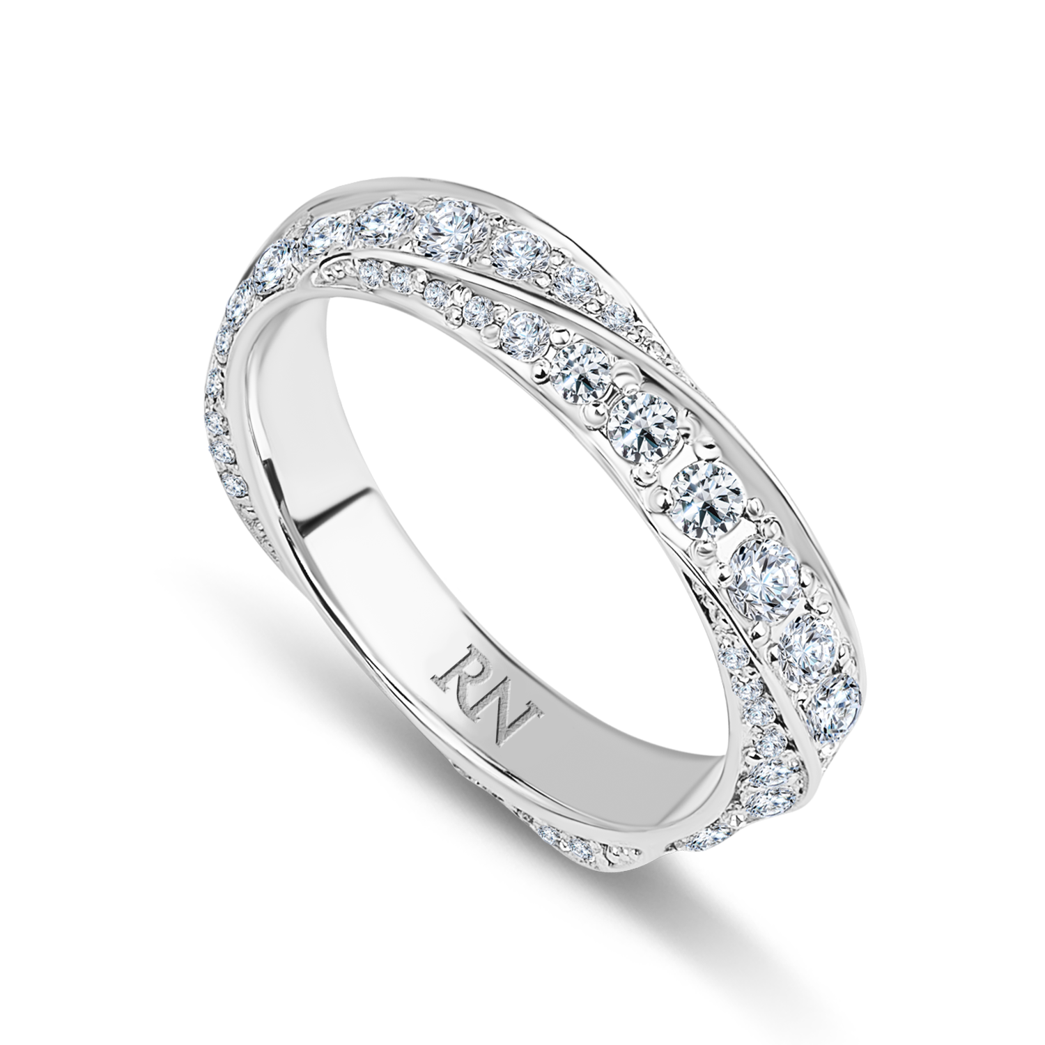 Элегантное женское обручальное кольцо из белого золота с бриллиантовыми дорожками. Шинка сложной спиралевидной формы. Изысканная инкрустация бриллиантами разных размеров классической огранки.