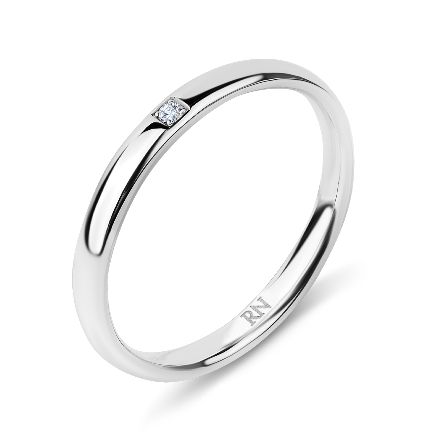 Обручальное кольцо с узкой глянцевой шинкой инкрустировано бриллиантом.