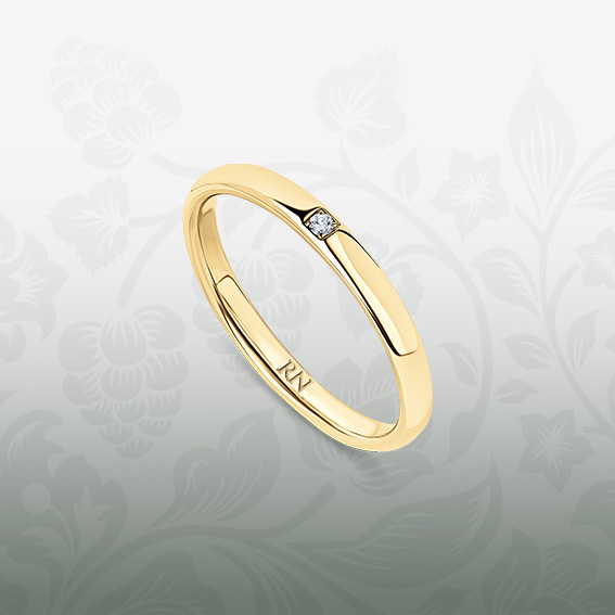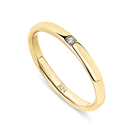 Обручальное кольцо с узкой глянцевой шинкой инкрустировано бриллиантом.