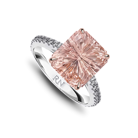 Кольцо с Морганитом фантазийной огранки привлекает внимание своей необычной цветовой гаммой и завораживающей игрой. Центральный камень — роскошный персиковый морганит весом 5.25 карата обладает редкой фантазийной огранкой, которая подчеркивает глубину и насыщенность оттенка.