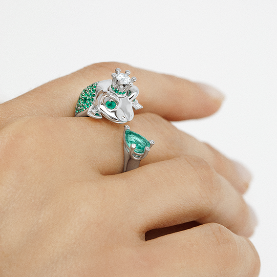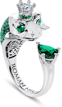 Кольцо "Царевна-лягушка" из белого золота 750 пробы с изумрудами и бриллиантами. Коллекция “Сказки”.