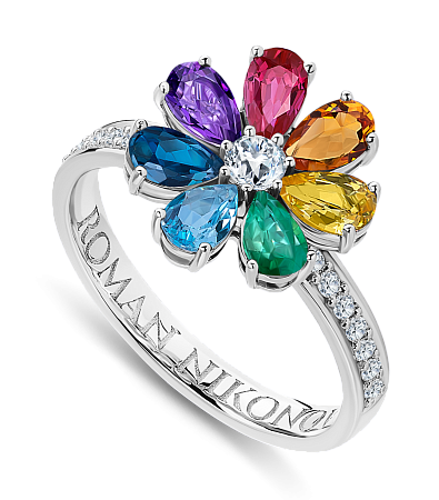 Кольцо «Цветик-семицветик» из белого золота 750 пробы со вставками: бриллианты, сапфиры, рубины, изумруды, топаз Swiss, топаз London, аметист, цитрины. Коллекция «Сказки».