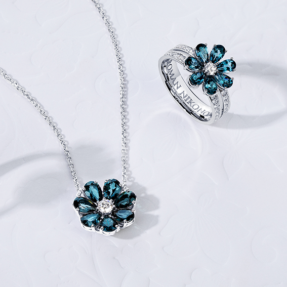 Кольцо и белого золота с широкой шинкой, украшенной бриллиантовой дорожкой. Центральный элемент – цветок с 7 лепестками – топазы London огранки «груша», сердцевина цветка – бриллиант классической огранки.