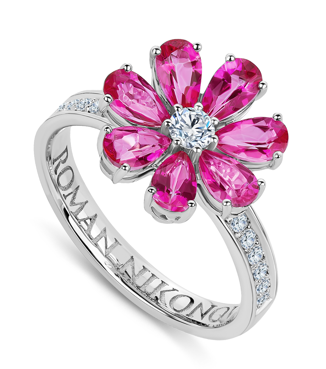 Кольцо из белого золота с узкой шинкой, украшенной бриллиантовой дорожкой. Центральный элемент – цветик с 7 лепестками – розовые топазы огранки «груша», сердцевина цветика – бриллиант классической огранки. Кольцо с динамичным дизайном оживает благодаря блеску камней, создающих потрясающий визуальный эффект с игрой света и теней на их поверхности. Откройте мир бесконечных возможностей, ведь в ваших руках сконцентрирована сила настоящего волшебного цветка! Не бойтесь выходить за рамки и делать то, что вас радует и воодушевляет.