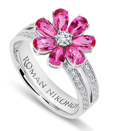 Кольцо и белого золота с широкой шинкой, украшенной бриллиантовой дорожкой. Центральный элемент – цветик с 7 лепестками – розовые топазы огранки «груша», сердцевина цветика – бриллиант классической огранки.