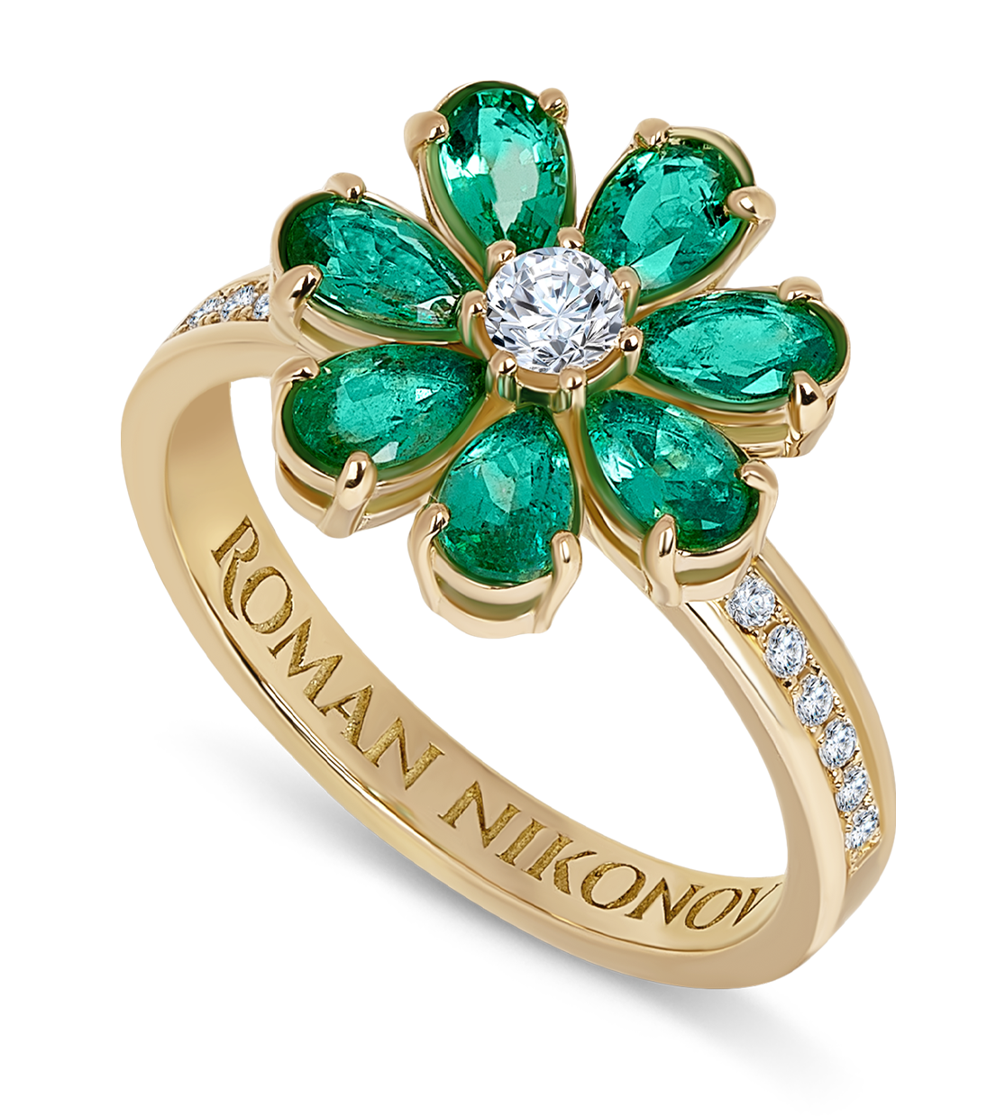 Кольцо из желтого золота с узкой шинкой, украшенной бриллиантовой дорожкой. Центральный элемент – цветок с 7 лепестками – изумрудами огранки «груша», в центре – бриллиант.