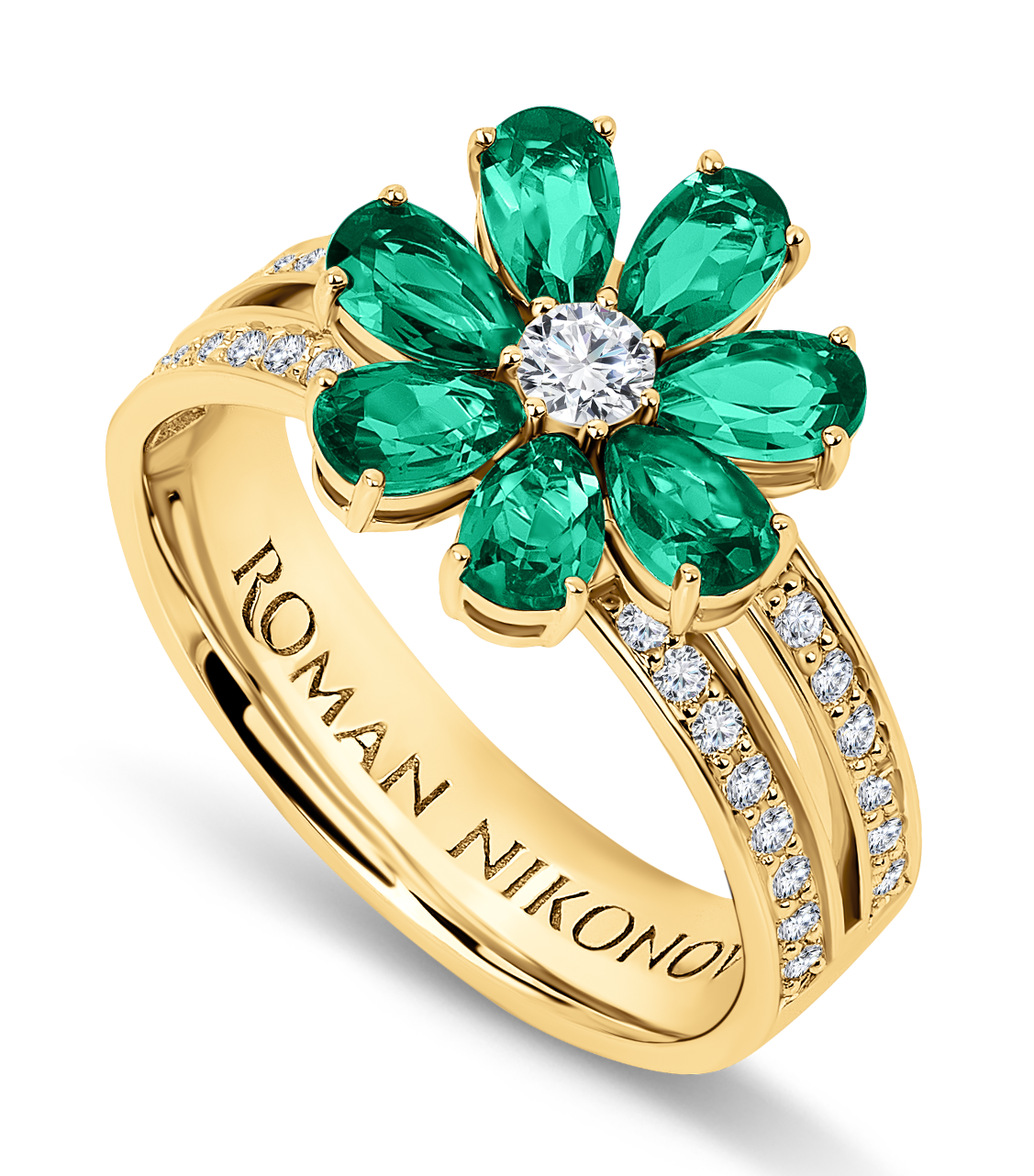 Кольцо и желтого золота с широкой шинкой, украшенной бриллиантовой дорожкой. Центральный элемент – цветик с 7 лепестками – изумруды огранки «груша», сердцевина цветика – бриллиант классической огранки.