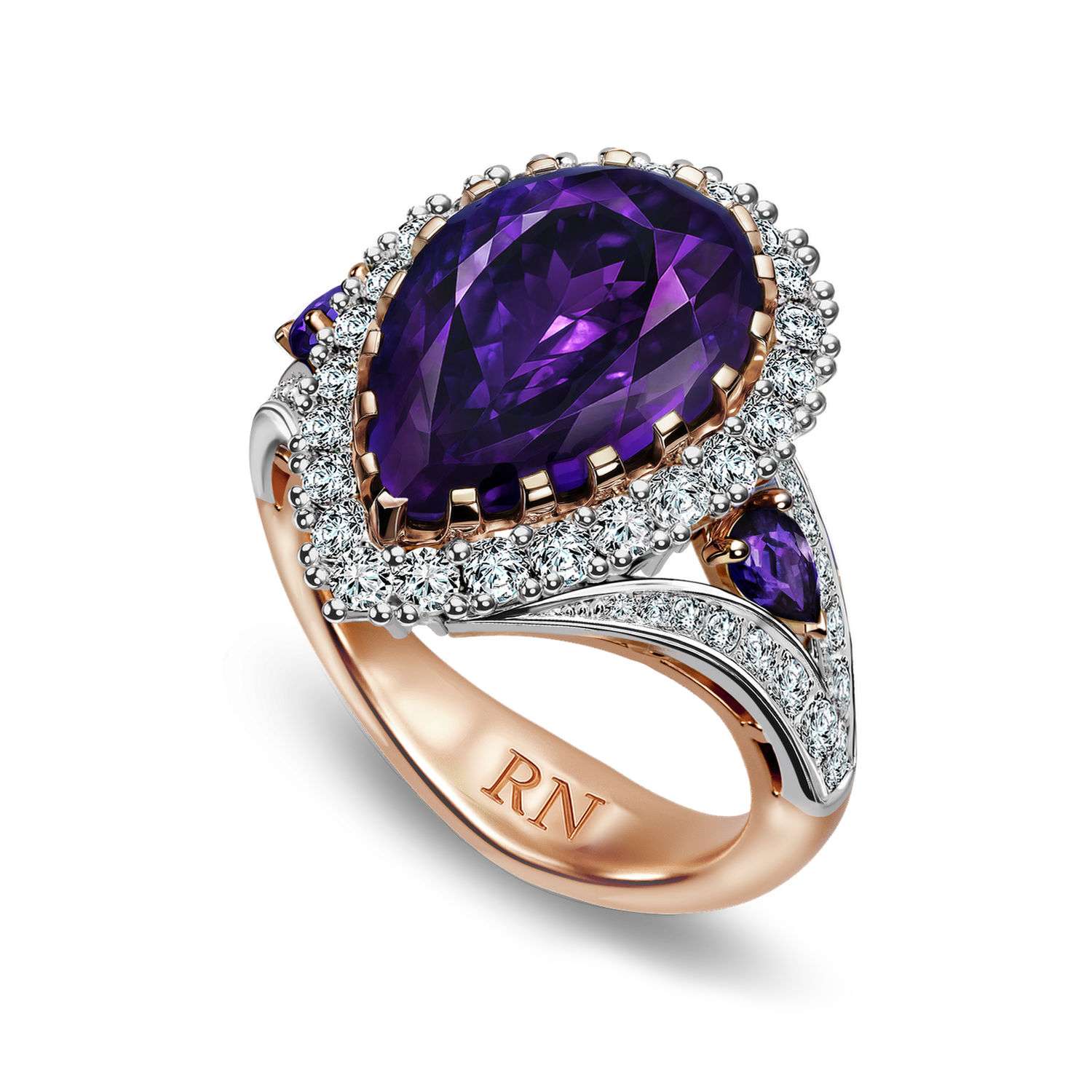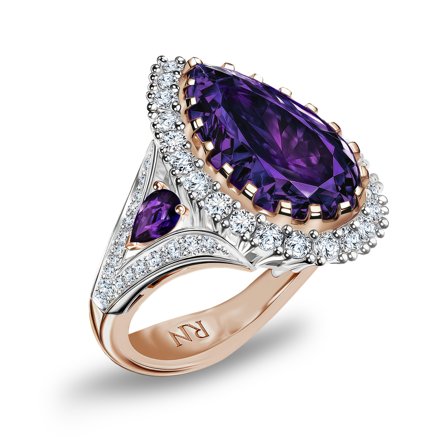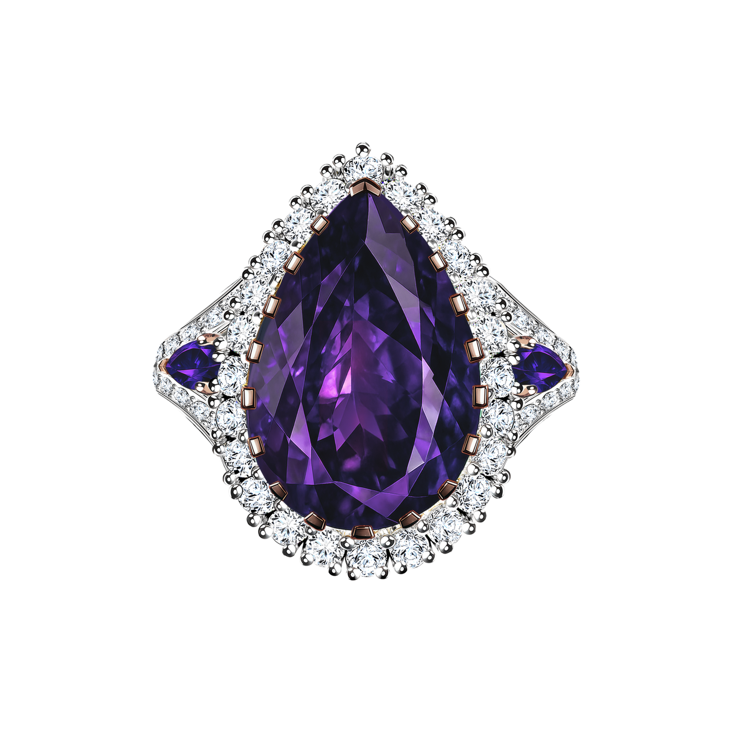 Роскошное кольцо, инкрустированное россыпью бриллиантов с яркими аметистами классической огранки "груша" в центре и у основания украшения.