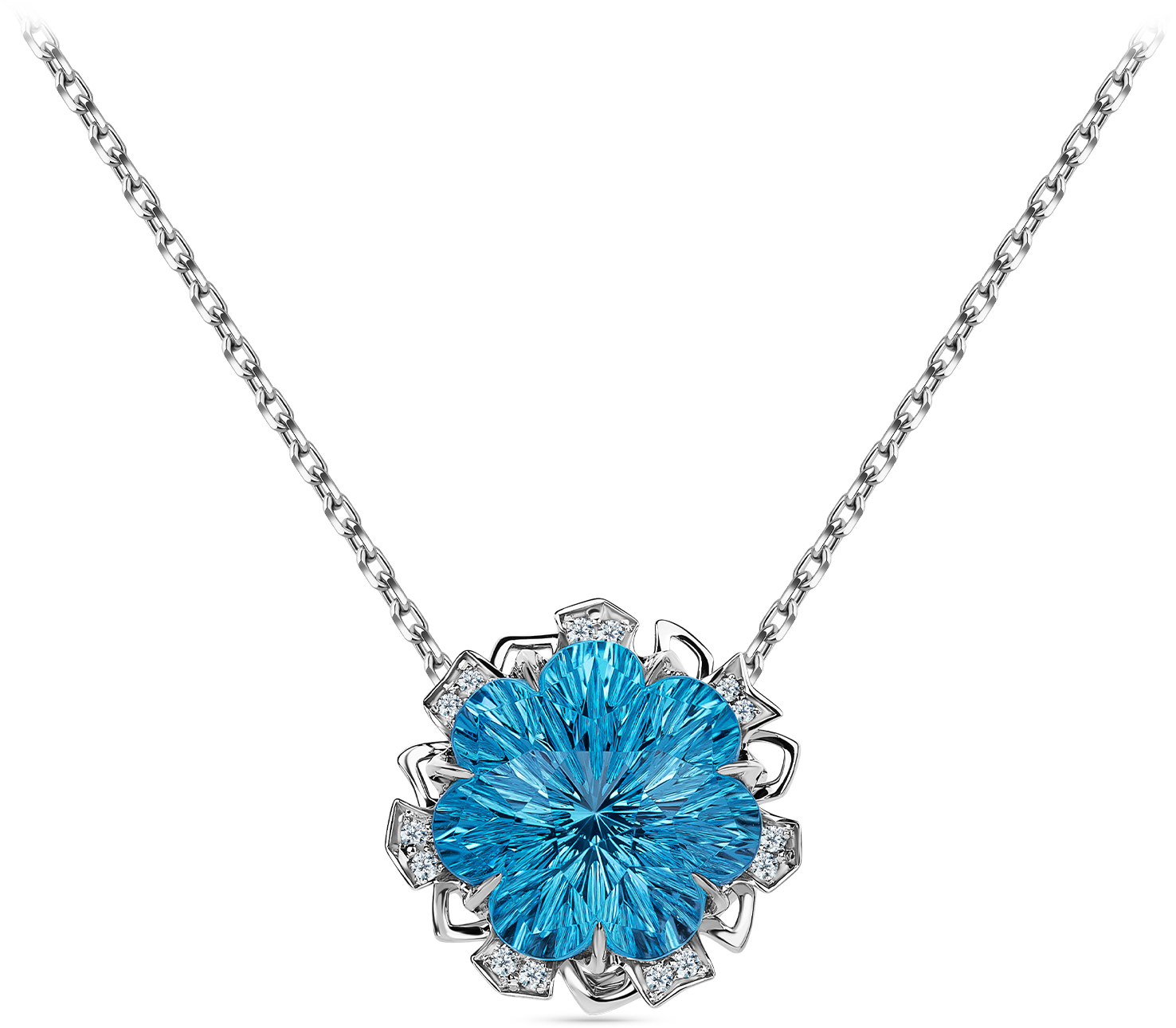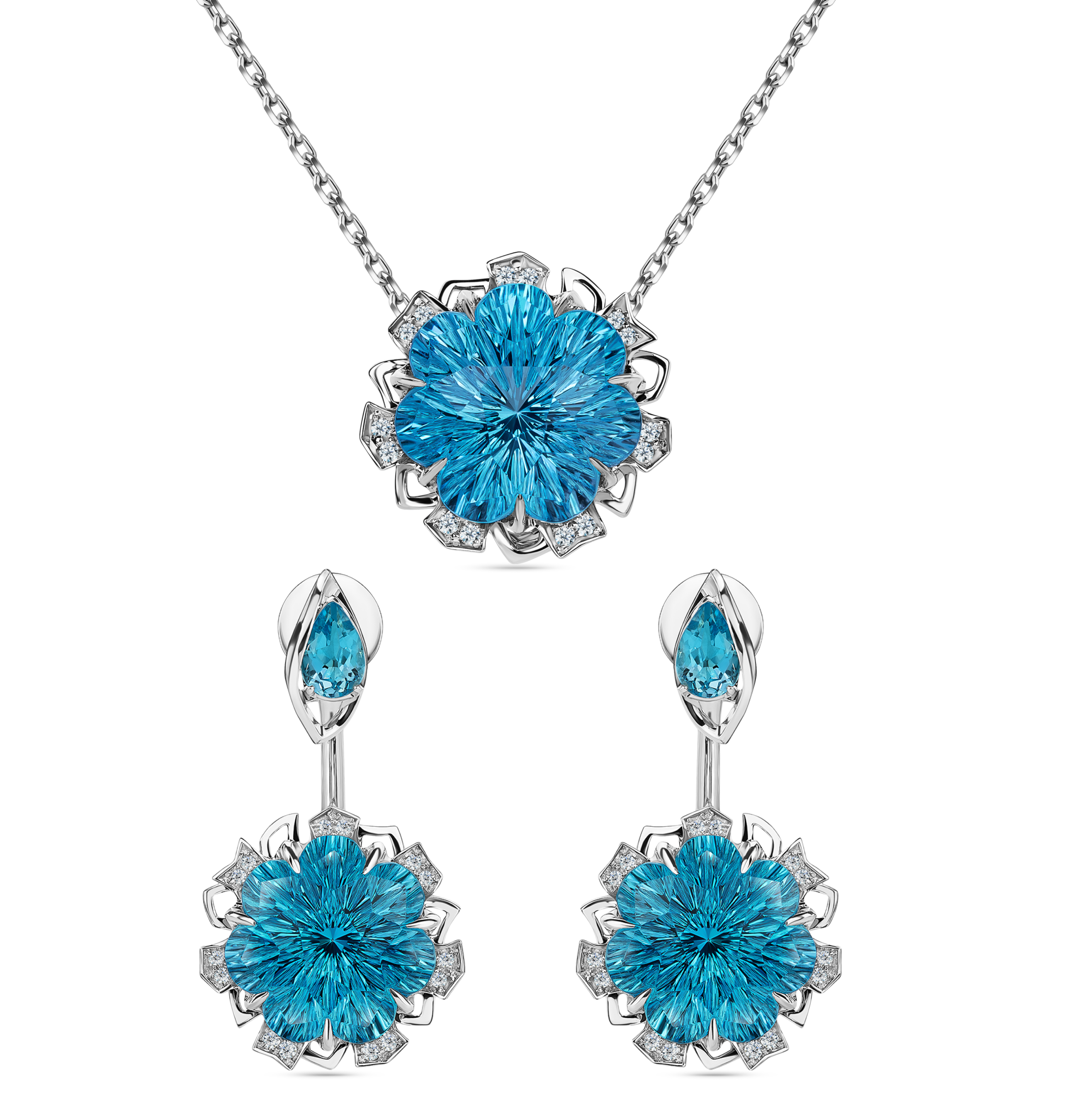 Подвеска и серьги «Каменный цветок» из белого золота 750 пробы с бриллиантами и топазами Свисс.