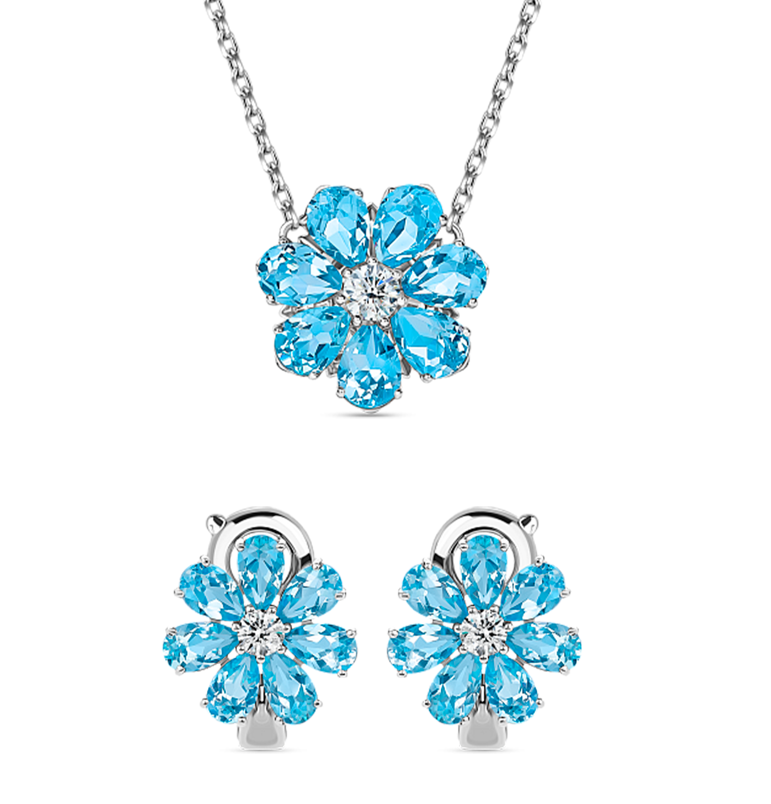 Пусеты и подвеска «Цветик» из белого золота 750 пробы с топазами Свисс и бриллиантами. Коллекция «Сказки».