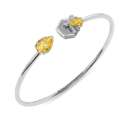 Яркий браслет из 18-ти каратного белого золота с пчелой на соте и каплей меда в центре. Преимущество браслета в его утонченной, гибкой форме, благодаря которой украшение легко надевать. Браслет изящно смотрится на запястье, а игра света подчеркивает яркий колорит цитринов.