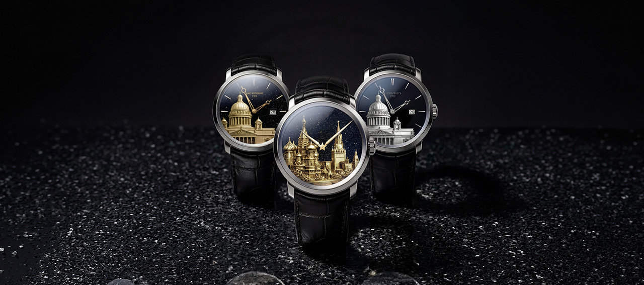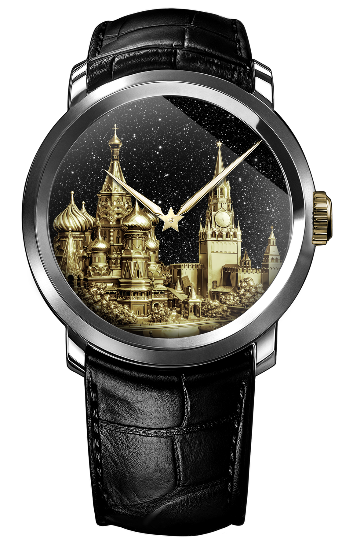 Художественный циферблат с объемным изображением архитектурного ансамбля Красной площади выполнен из желтого золота 750 пробы на черном авантюрине создающем эффект ночного неба.