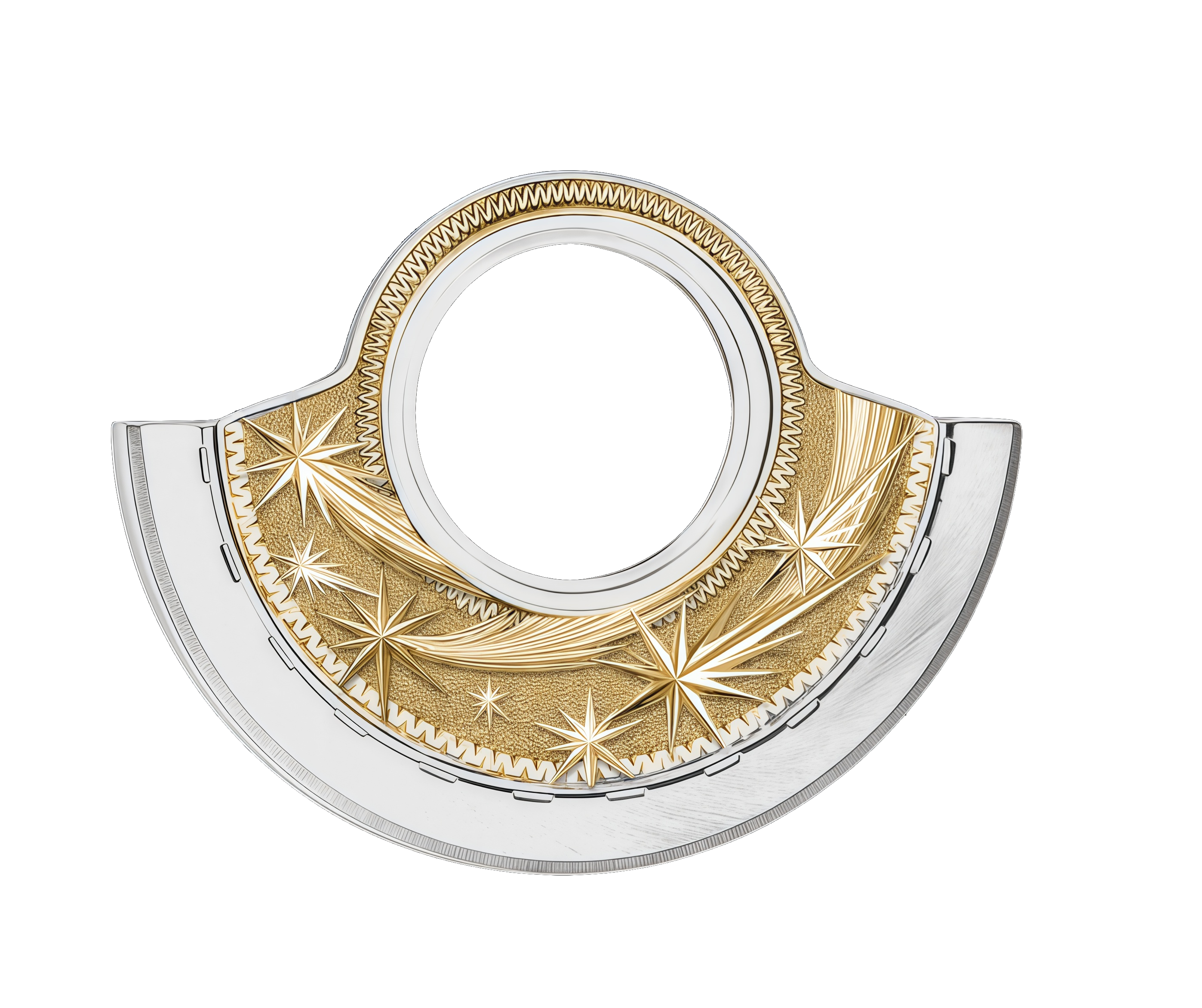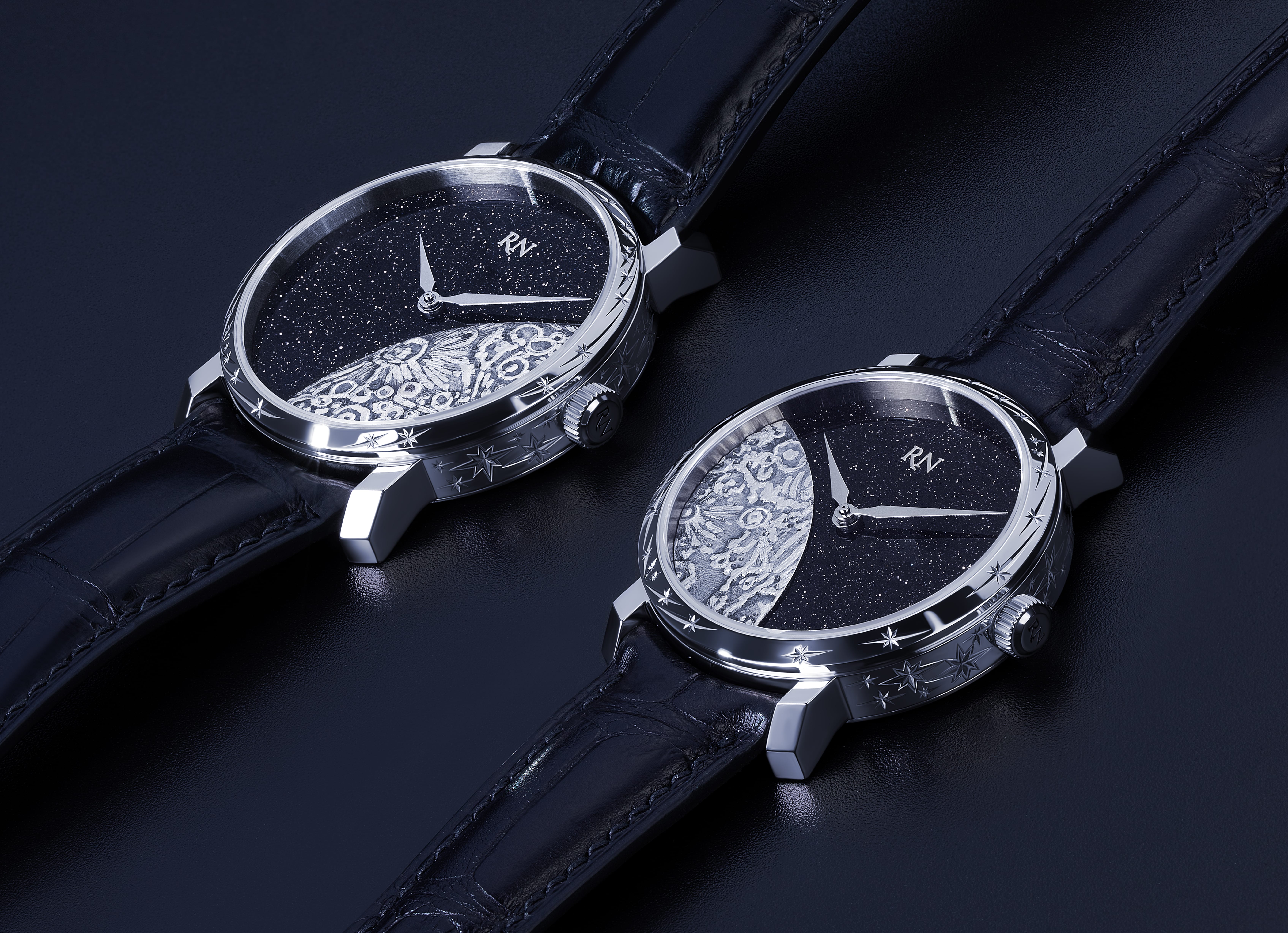 Дополняют фактуру силуэты космических тел, выгравированные вручную. Гравировка – декоративное искусство. Мастер-гравер, используя тщательно подобранный набор инструментов, вручную под микроскопом вырезает изысканные рисунки на самых благородных материалах. С высокой точностью он создает рельеф на поверхности, действуя с невероятной осторожностью и терпением, ведь малейшее неверное движение может перечеркнуть результат многодневной работы и потребовать начать все заново.