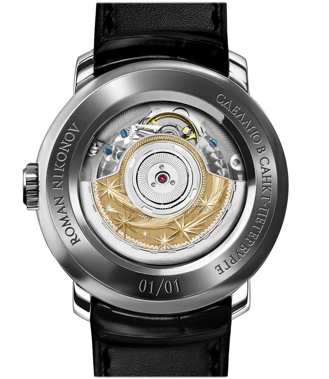 Открытая крышка корпуса позволяет наблюдать за работой эксклюзивного тонкого ротора (автоматического подзаводного механизма). На ротор нанесена уникальная фактура frosted, создающая эффект мерцания, напоминающий иней или россыпь бриллиантов.