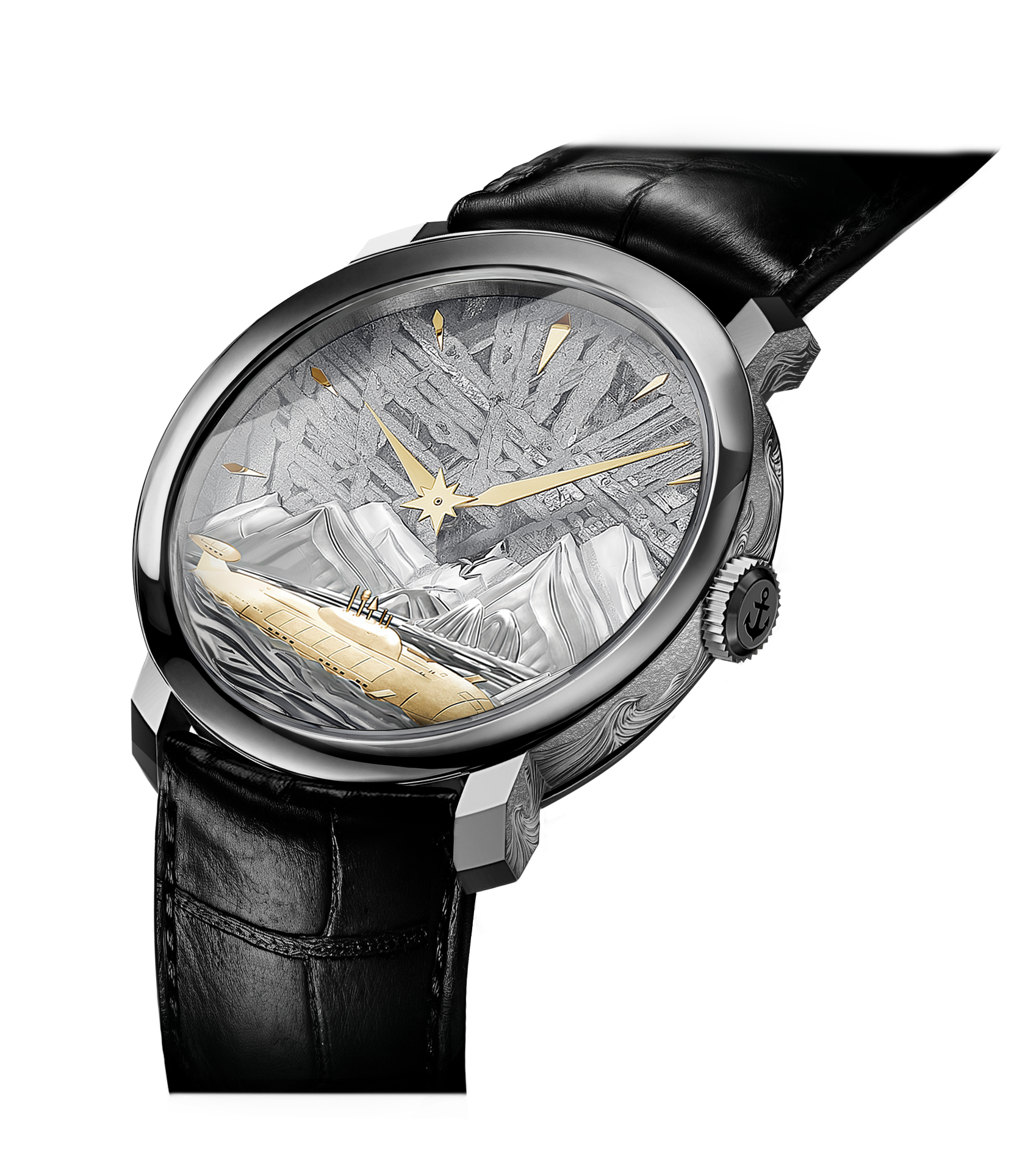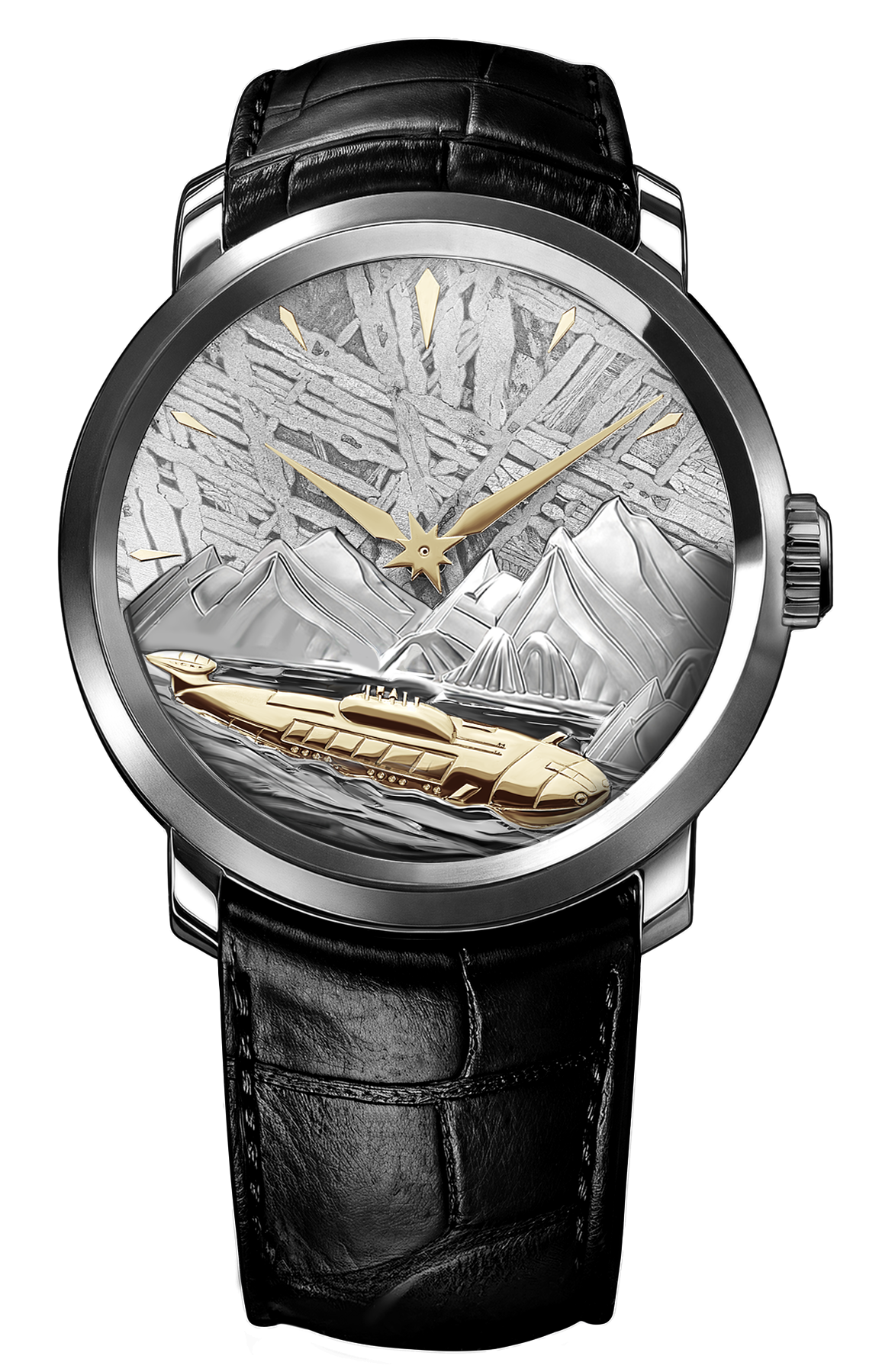 Их уникальный циферблат, выполненный из натурального метеорита, завораживает своим узором и игрой света, напоминая о бескрайних морских просторах.
