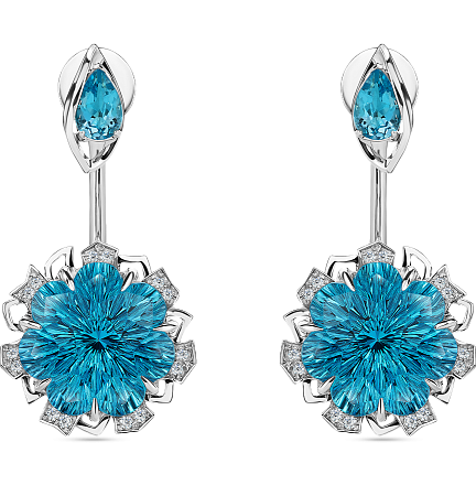 Фантазийные серьги-пусеты со съемными подвижными подвесками-«стеблями», инкрустированные топазами Swiss Blue и бриллиантами. Это позволяет носить серьги как классические пусеты.