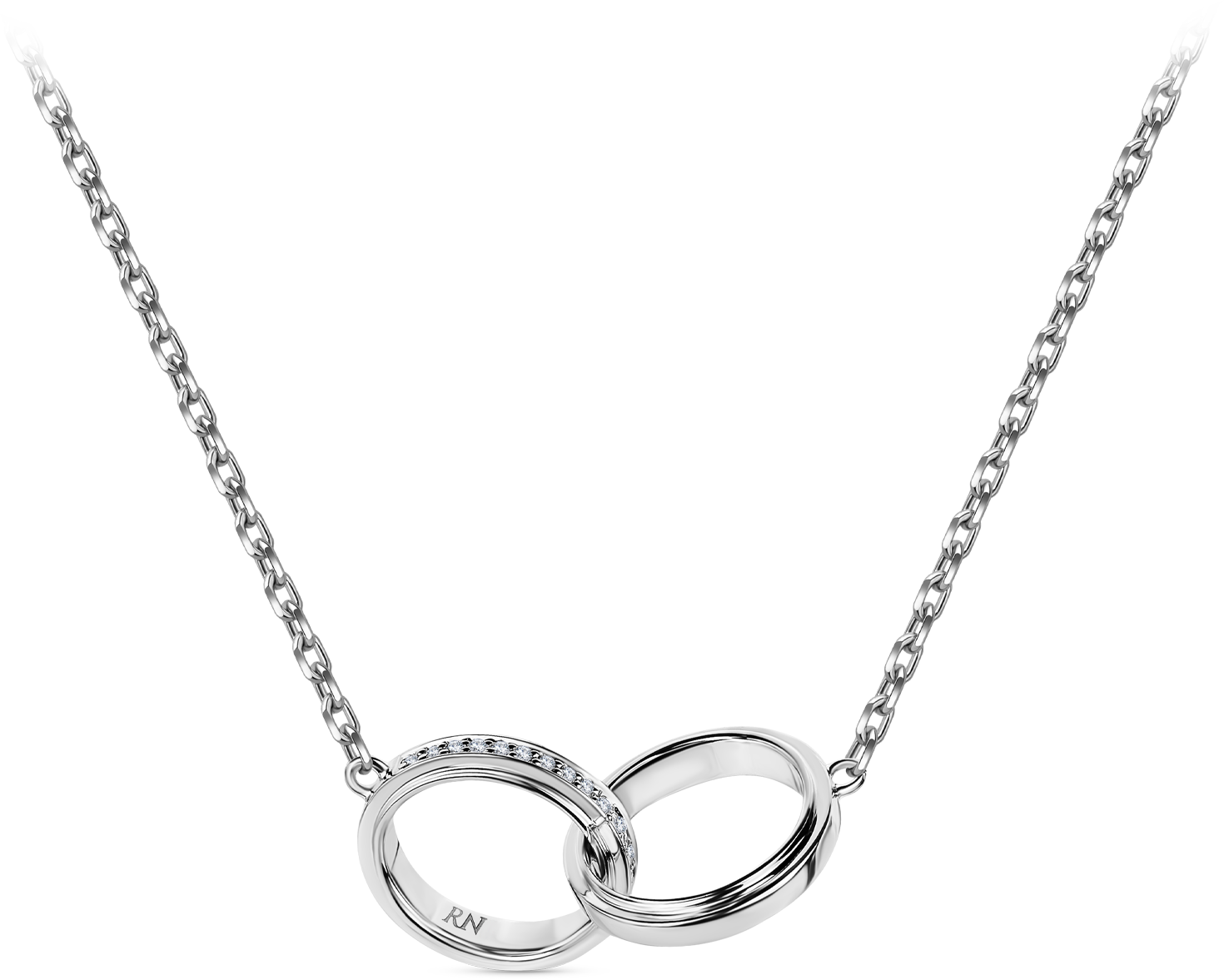 Подвеска с центральным элементом из пары переплетенных колец, образующих символ бесконечности. Каждое кольцо имеет геометричную текстуру с гранями. Одно инкрустировано бриллиантами, второе – без вставок. Изделие сочетает в себе элементы непревзойденной классики и сложную геометрию дизайна. Подвеска прекрасно дополнит обручальный сет, а также станет приятным подарком на годовщину свадьбы.