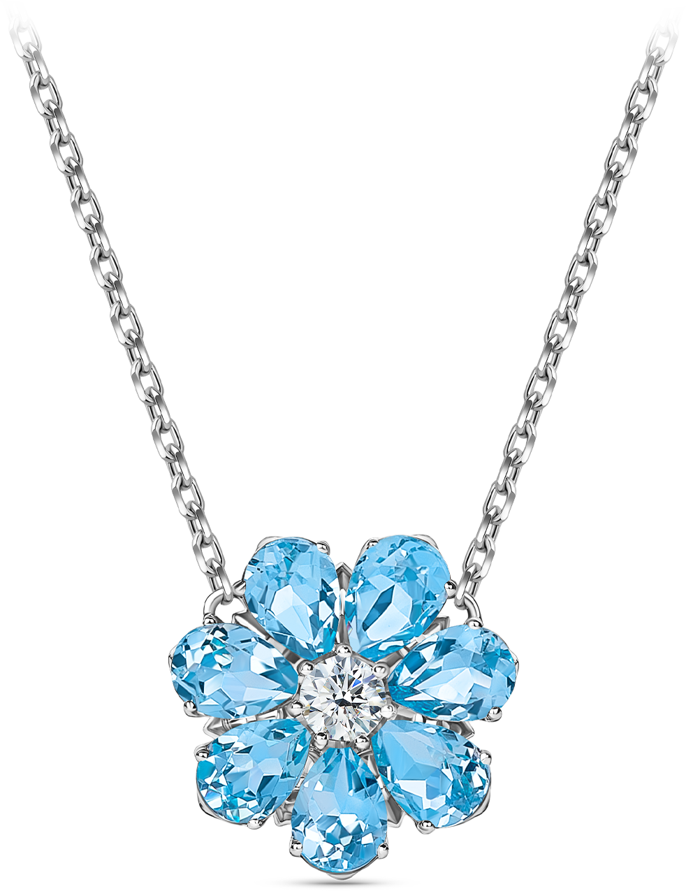 Центральный элемент – цветик с 7 лепестками – топазы Свисс огранки «груша», сердцевина цветика – бриллиант классической огранки.