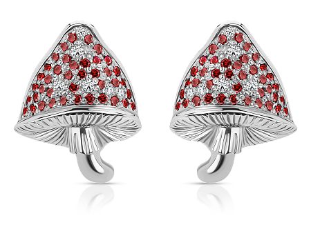 Дизайнерские серьги-гвоздики в виде двух объемных грибочков-мухоморов, инкрустированных бриллиантами и яркими рубинами. Чудесные грибы: редкий экземпляр нашего сказочного леса.