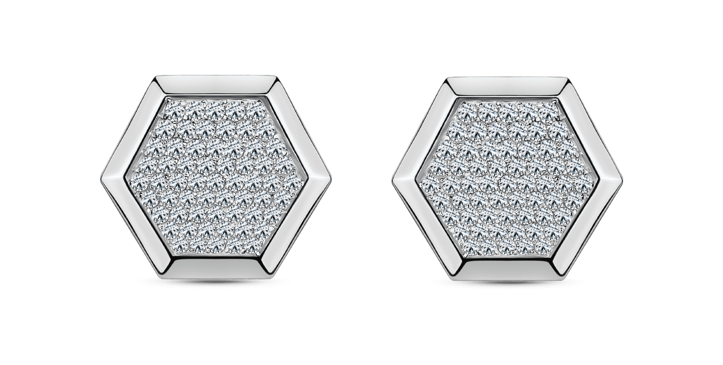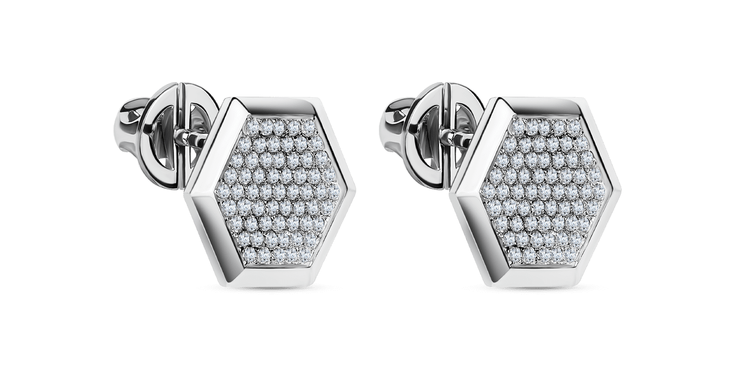 Серьги-гвоздики в форме геометрически совершенных медовых сот, усыпанных россыпью бриллиантов в технике паве.