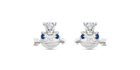 Серьги-гвоздики в виде лягушек в короне, увенчанной бриллиантом. Лягушка держит драгоценную стрелу. Глазки лягушки – яркие сапфиры.