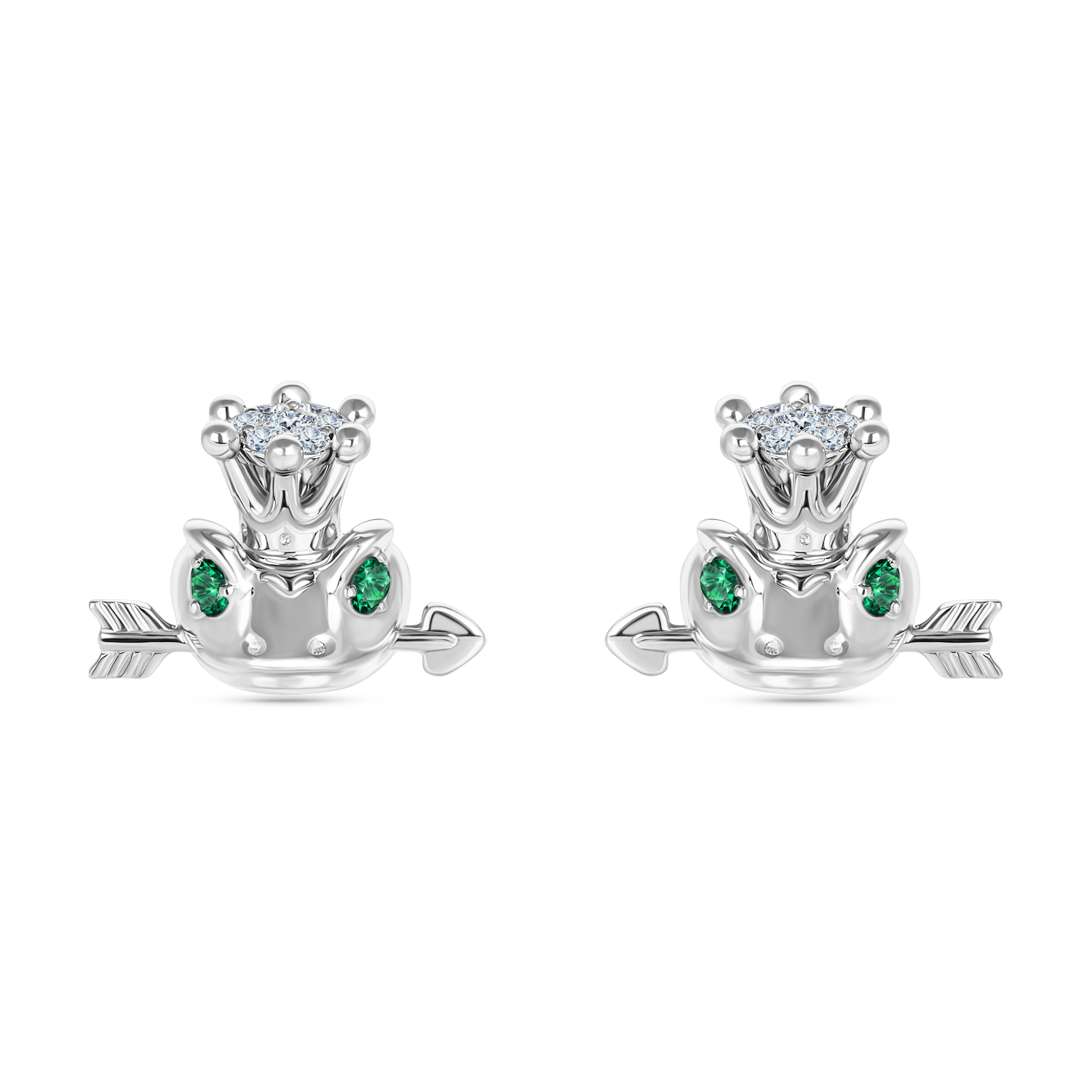 Серьги-гвоздики в виде лягушек в короне, увенчанной бриллиантом. Лягушка держит драгоценную стрелу. Глазки лягушки – яркие изумруды.