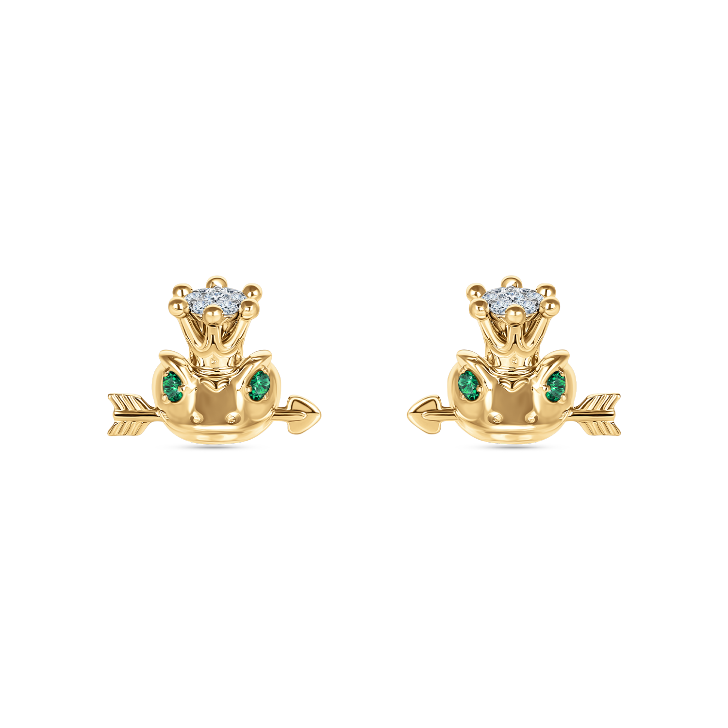 Серьги-гвоздики в виде лягушек в короне, увенчанной бриллиантами. Во рту лягушка держит драгоценную стрелу. Глазки лягушки – яркие изумруды.
