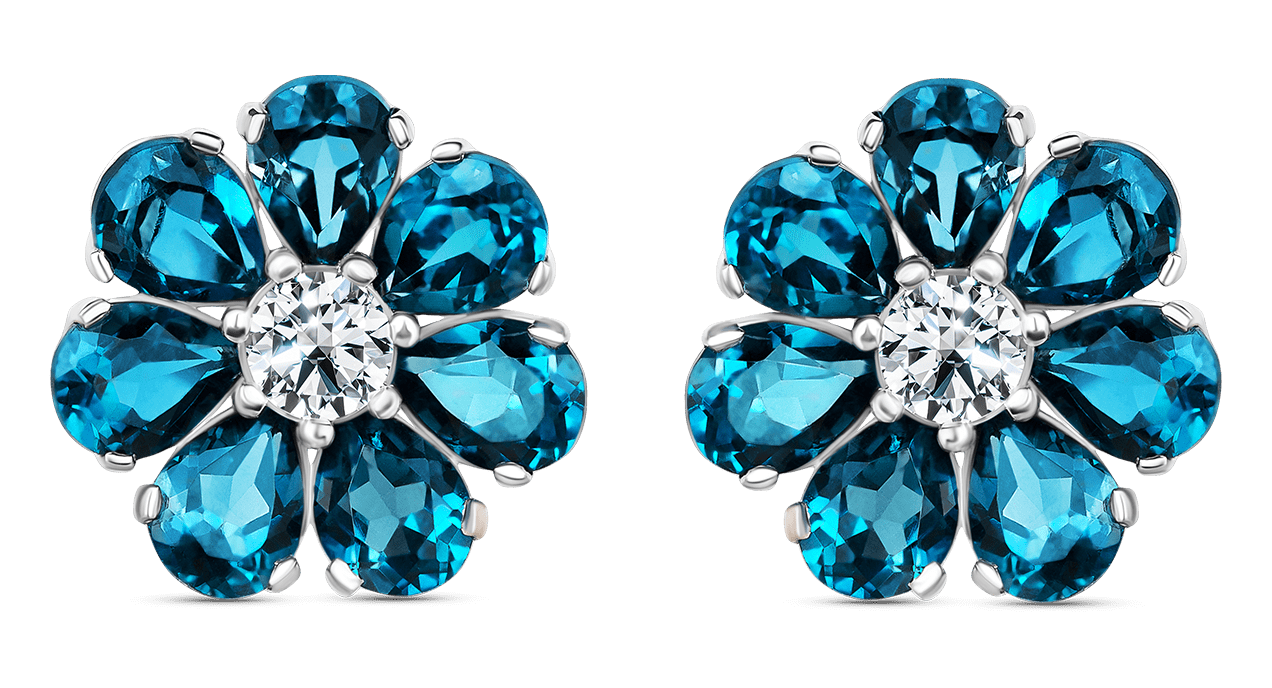 Серьги-гвоздики из белого золота в виде цветиков с 7 лепестками – топазы Лондон огранки «груша» - и сердцевиной – бриллиантом классической огранки. Пусеты с динамичным дизайном оживают благодаря блеску камней, создающих потрясающий визуальный эффект с игрой света и теней на их поверхности. Откройте мир бесконечных возможностей, ведь в ваших руках сконцентрирована сила настоящего волшебного цветка! Не бойтесь выходить за рамки и делать то, что вас радует и воодушевляет.