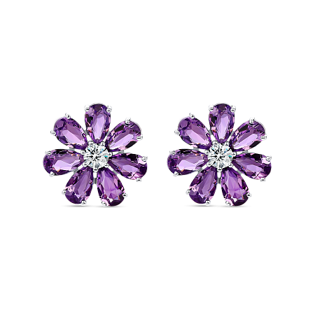 Пусеты «Цветик» из белого золота 750 пробы с аметистами и бриллиантами. Коллекция «Сказки».