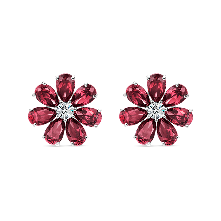 Пусеты «Цветик» и белого золота 750 пробы с родолитами и бриллиантами. Коллекция «Сказки».