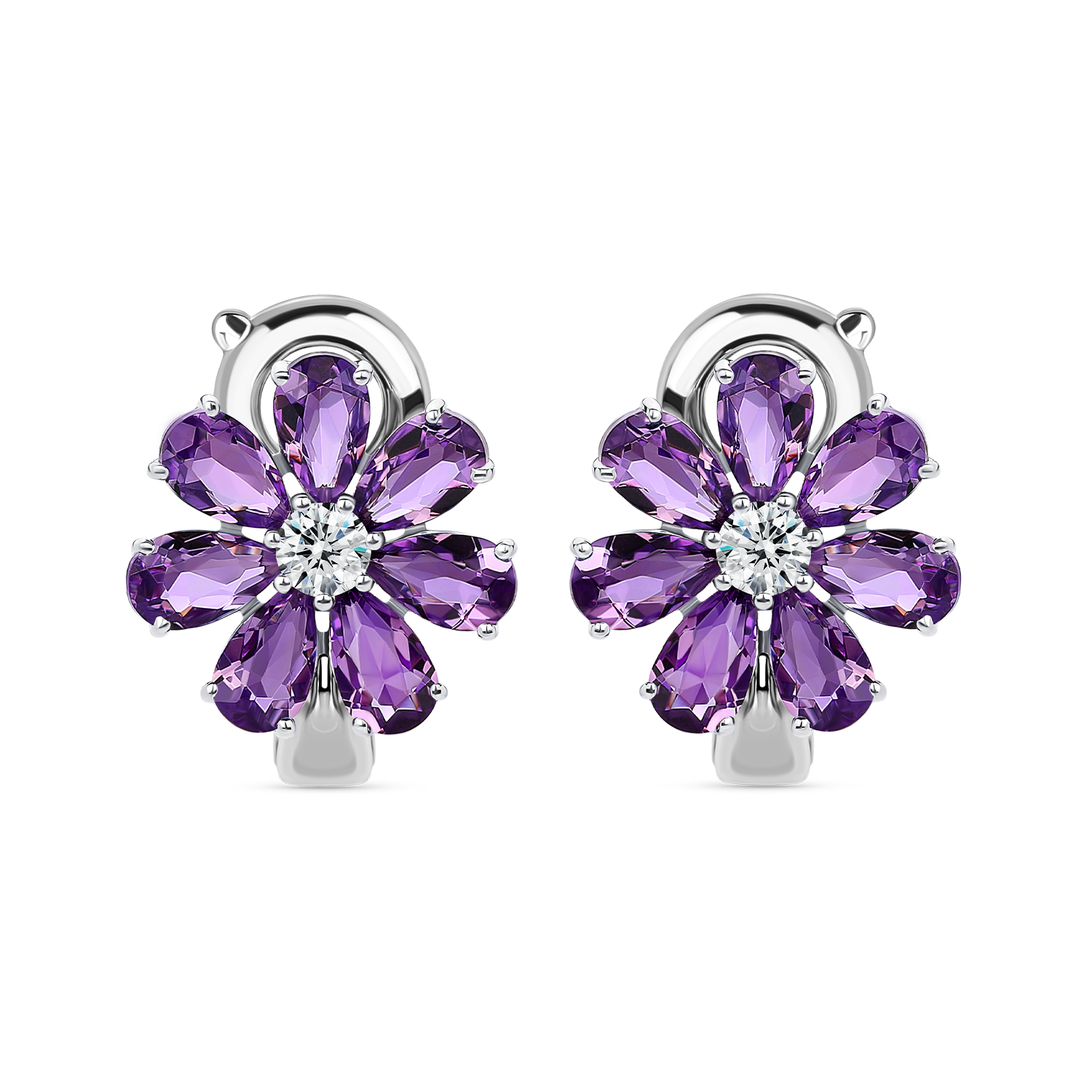Пусеты «Цветик» из белого золота 750 пробы с аметистами и бриллиантами. Коллекция «Сказки».