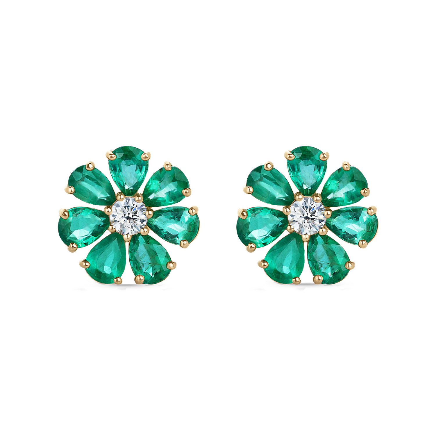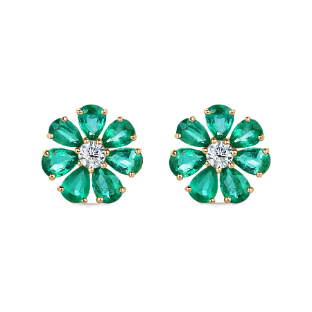 Серьги-гвоздики из желтого золота в виде цветиков с 7 лепестками – изумрудами огранки «груша» – и сердцевиной – бриллиантом классической огранки. Пусеты с динамичным дизайном оживают благодаря блеску камней, создающих потрясающий визуальный эффект с игрой света и теней на их поверхности. Откройте мир бесконечных возможностей, ведь в ваших руках сконцентрирована сила настоящего волшебного цветка! Не бойтесь выходить за рамки и делать то, что вас радует и воодушевляет.