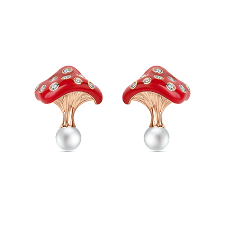 Очаровательные серьги-гвоздики в форме объемных грибочков-мухоморов. Шапка покрыта сочной красной эмалью и вставками ослепительных бриллиантов. Золотая ножка имеет фактуру и завершается нежной жемчужиной.